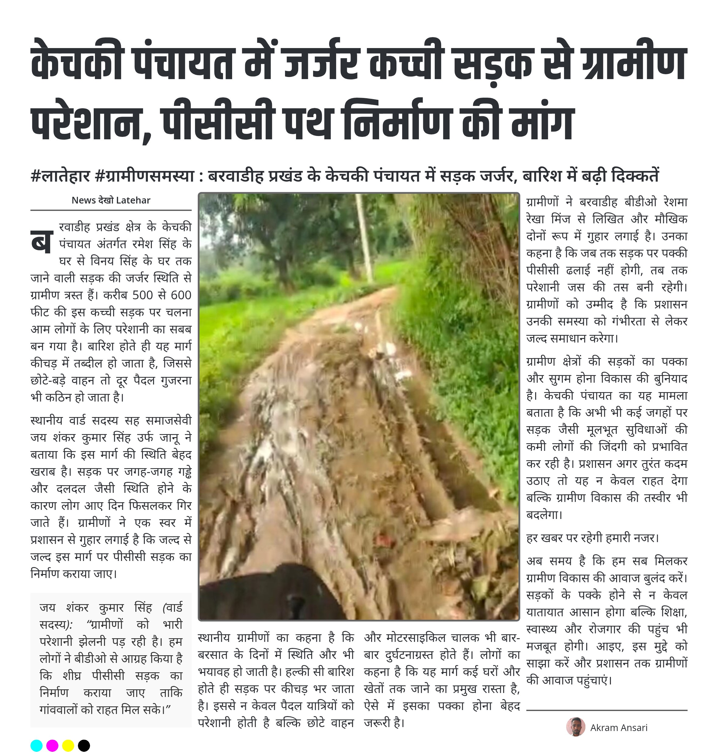ग्रामीण क्षेत्रों की सड़कों का पक्का और सुगम होना विकास की बुनियाद है। केचकी पंचायत का यह मामला बताता है कि अभी भी कई जगहों पर सड़क जैसी मूलभूत सुविधाओं की कमी लोगों की जिंदगी को प्रभावित कर रही है। प्रशासन अगर तुरंत कदम उठाए तो यह न केवल राहत देगा बल्कि ग्रामीण विकास की तस्वीर भी बदलेगा।