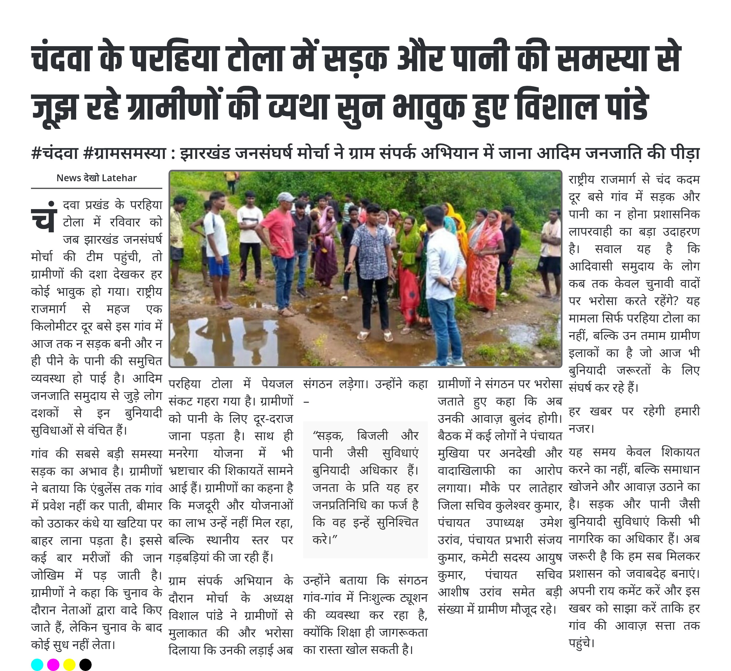 चंदवा प्रखंड के परहिया टोला में रविवार को जब झारखंड जनसंघर्ष मोर्चा की टीम पहुंची, तो ग्रामीणों की दशा देखकर हर कोई भावुक हो गया। राष्ट्रीय राजमार्ग से महज एक किलोमीटर दूर बसे इस गांव में आज तक न सड़क बनी और न ही पीने के पानी की समुचित व्यवस्था हो पाई है। आदिम जनजाति समुदाय से जुड़े लोग दशकों से इन बुनियादी सुविधाओं से वंचित हैं।