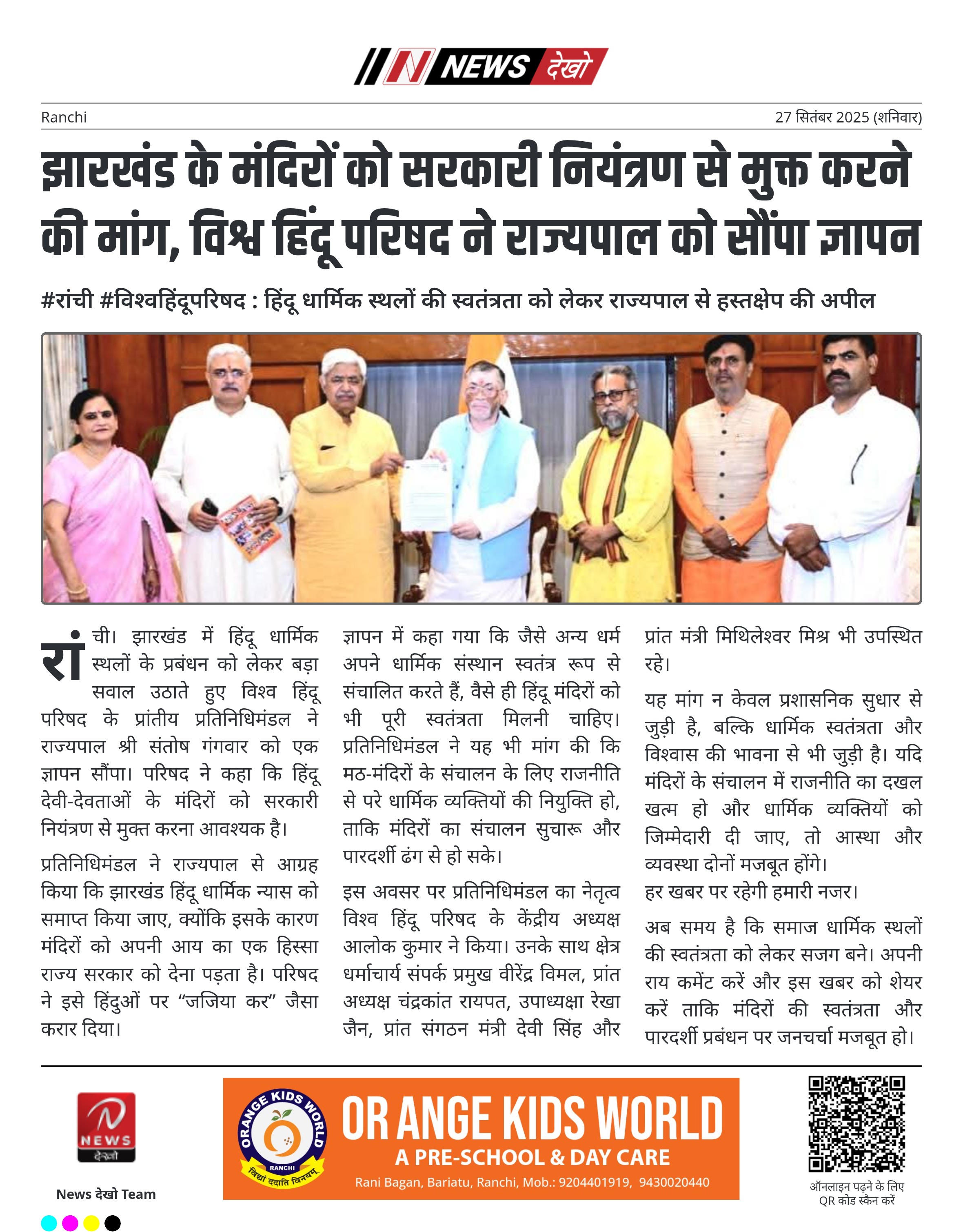 #रांची #विश्वहिंदूपरिषद : हिंदू धार्मिक स्थलों की स्वतंत्रता को लेकर राज्यपाल से हस्तक्षेप की अपील