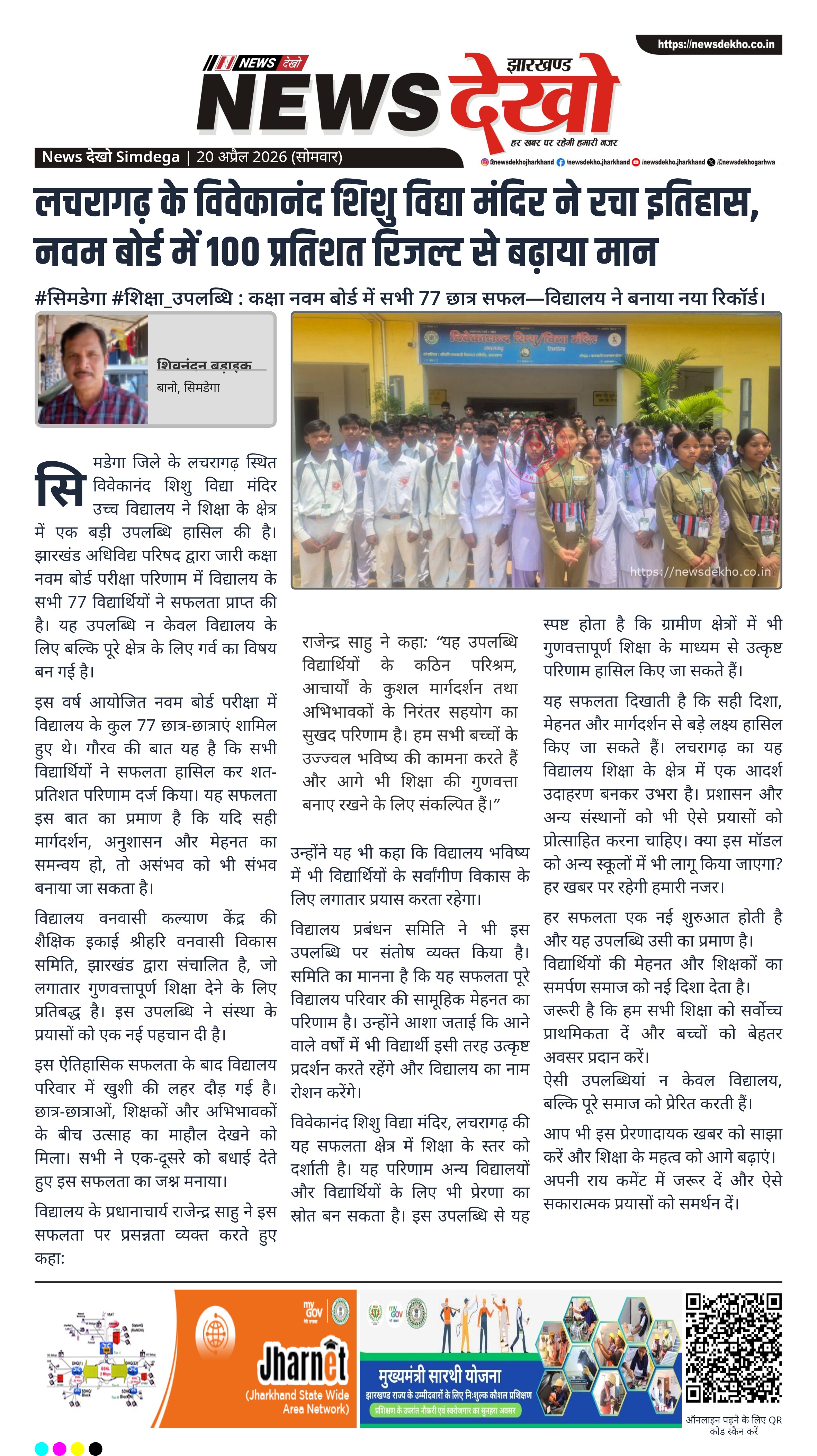 सिमडेगा जिले के लचरागढ़ स्थित विवेकानंद शिशु विद्या मंदिर उच्च विद्यालय ने कक्षा नवम बोर्ड परीक्षा में शत-प्रतिशत परिणाम हासिल कर नया इतिहास रच दिया है। झारखंड अधिविद्य परिषद द्वारा जारी परिणाम में सभी 77 विद्यार्थी सफल घोषित हुए। इस उपलब्धि से विद्यालय परिवार में उत्साह का माहौल है। प्रबंधन ने इसे विद्यार्थियों, शिक्षकों और अभिभावकों के संयुक्त प्रयास का परिणाम बताया है।