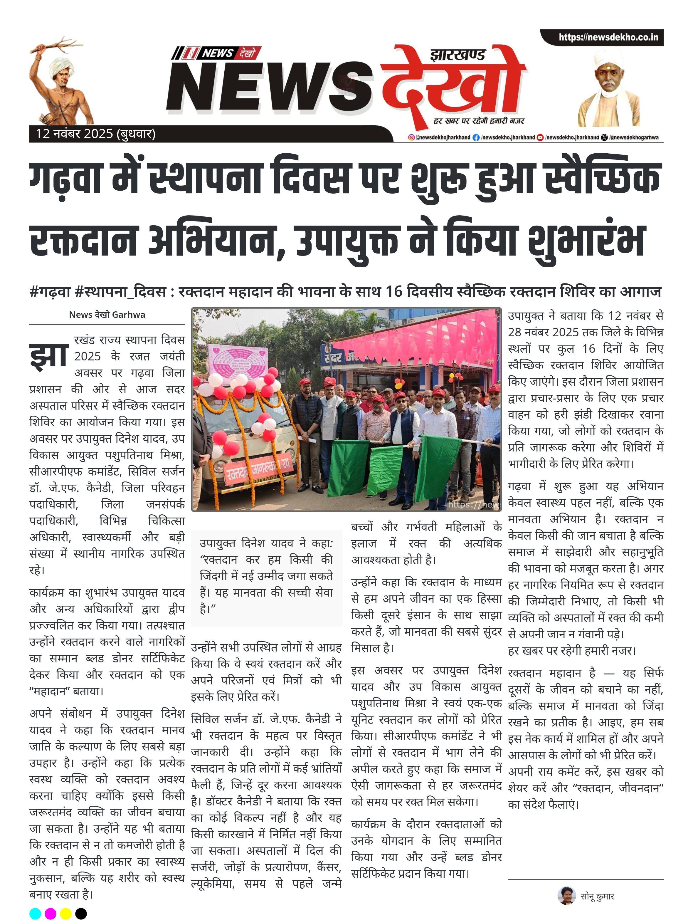 झारखंड राज्य स्थापना दिवस 2025 के रजत जयंती अवसर पर गढ़वा जिला प्रशासन की ओर से आज सदर अस्पताल परिसर में स्वैच्छिक रक्तदान शिविर का आयोजन किया गया। इस अवसर पर उपायुक्त दिनेश यादव, उप विकास आयुक्त पशुपतिनाथ मिश्रा, सीआरपीएफ कमांडेंट, सिविल सर्जन डॉ. जे.एफ. कैनेडी, जिला परिवहन पदाधिकारी, जिला जनसंपर्क पदाधिकारी, विभिन्न चिकित्सा अधिकारी, स्वास्थ्यकर्मी और बड़ी संख्या में स्थानीय नागरिक उपस्थित रहे।