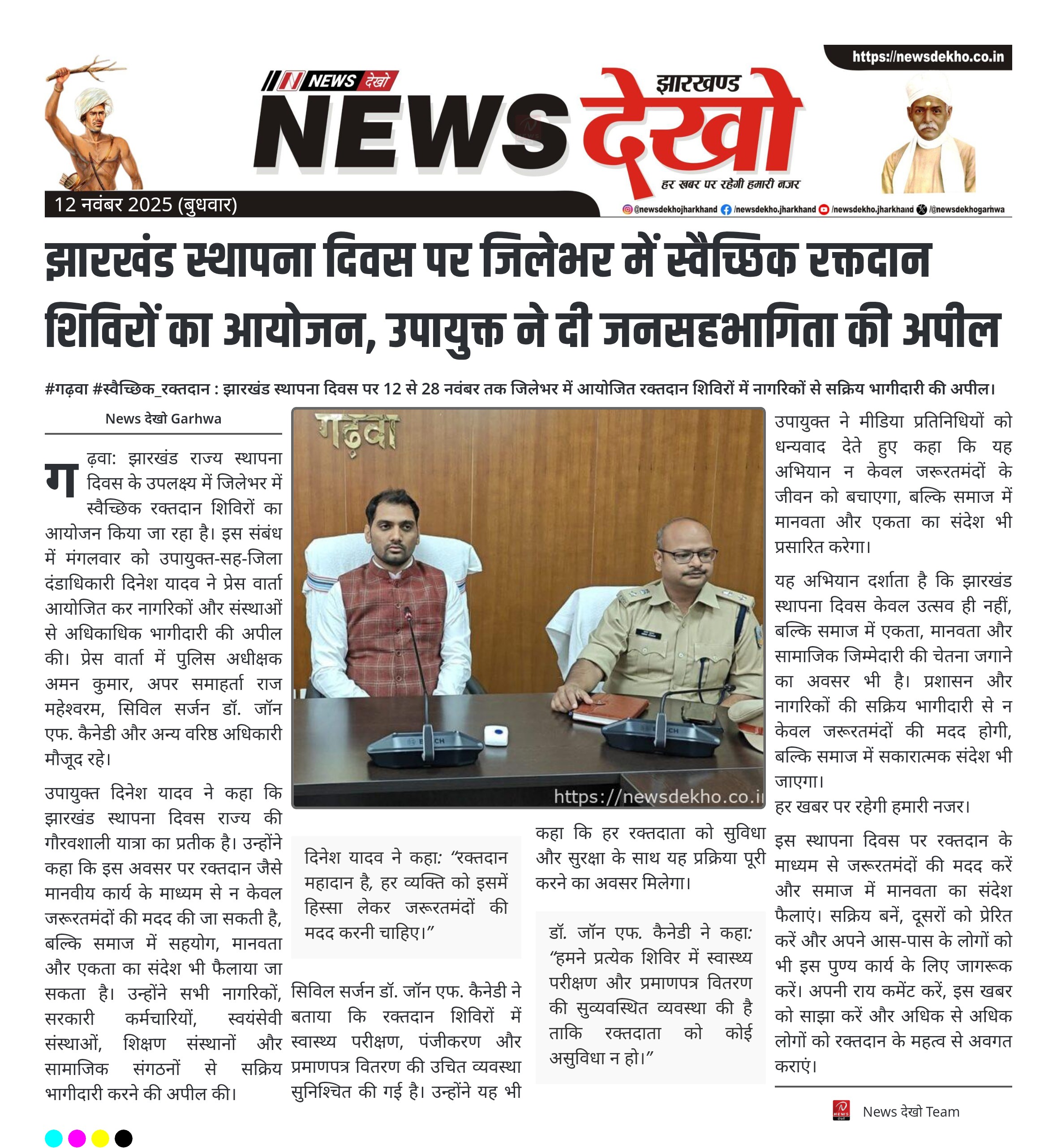 - गढ़वा जिले में झारखंड स्थापना दिवस के अवसर पर स्वैच्छिक रक्तदान शिविर 12 से 28 नवंबर 2025 तक आयोजित होंगे।