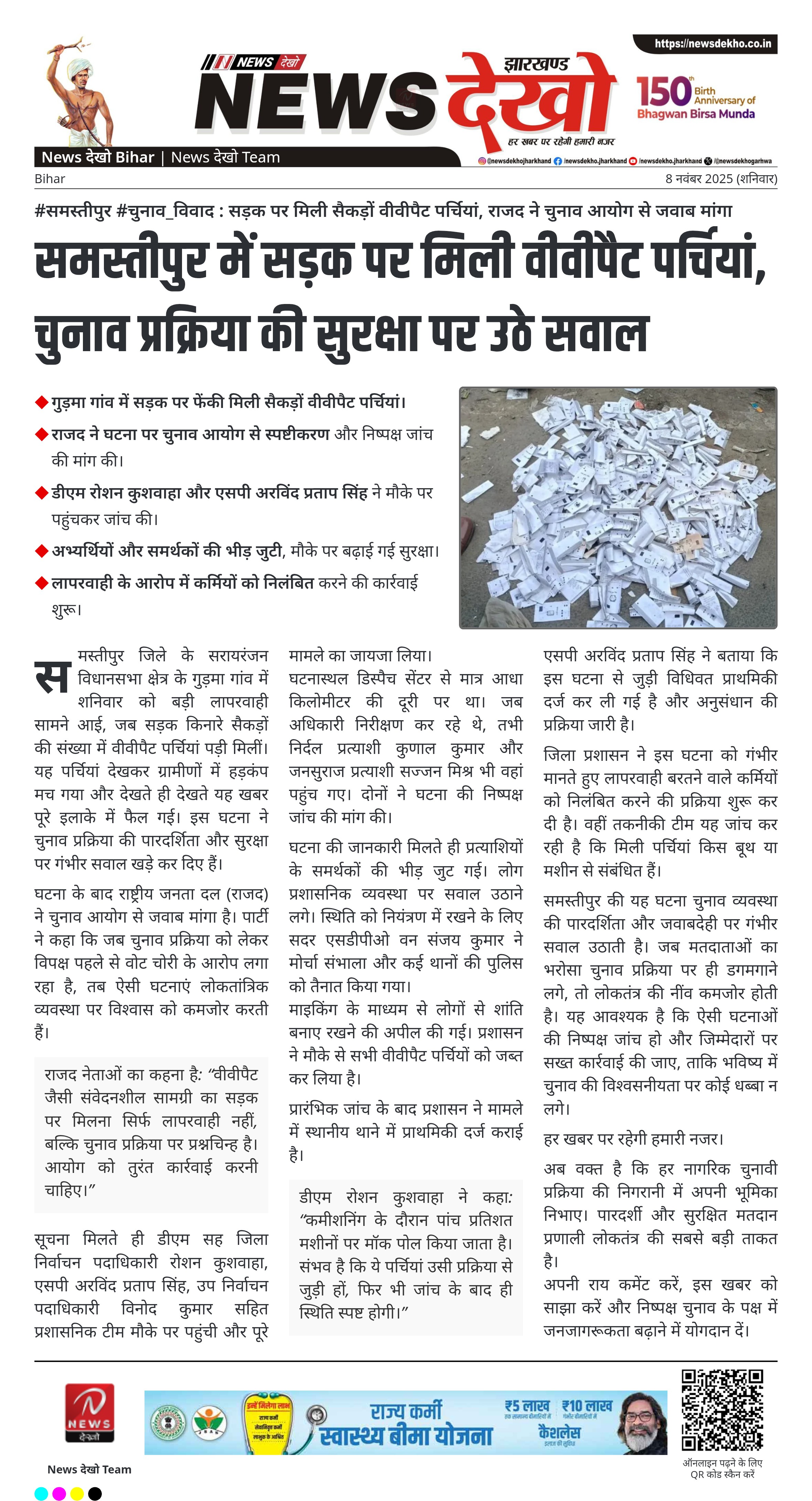समस्तीपुर जिले के सरायरंजन विधानसभा क्षेत्र के गुड़मा गांव में शनिवार को बड़ी लापरवाही सामने आई, जब सड़क किनारे सैकड़ों की संख्या में वीवीपैट पर्चियां पड़ी मिलीं। यह पर्चियां देखकर ग्रामीणों में हड़कंप मच गया और देखते ही देखते यह खबर पूरे इलाके में फैल गई। इस घटना ने चुनाव प्रक्रिया की पारदर्शिता और सुरक्षा पर गंभीर सवाल खड़े कर दिए हैं।