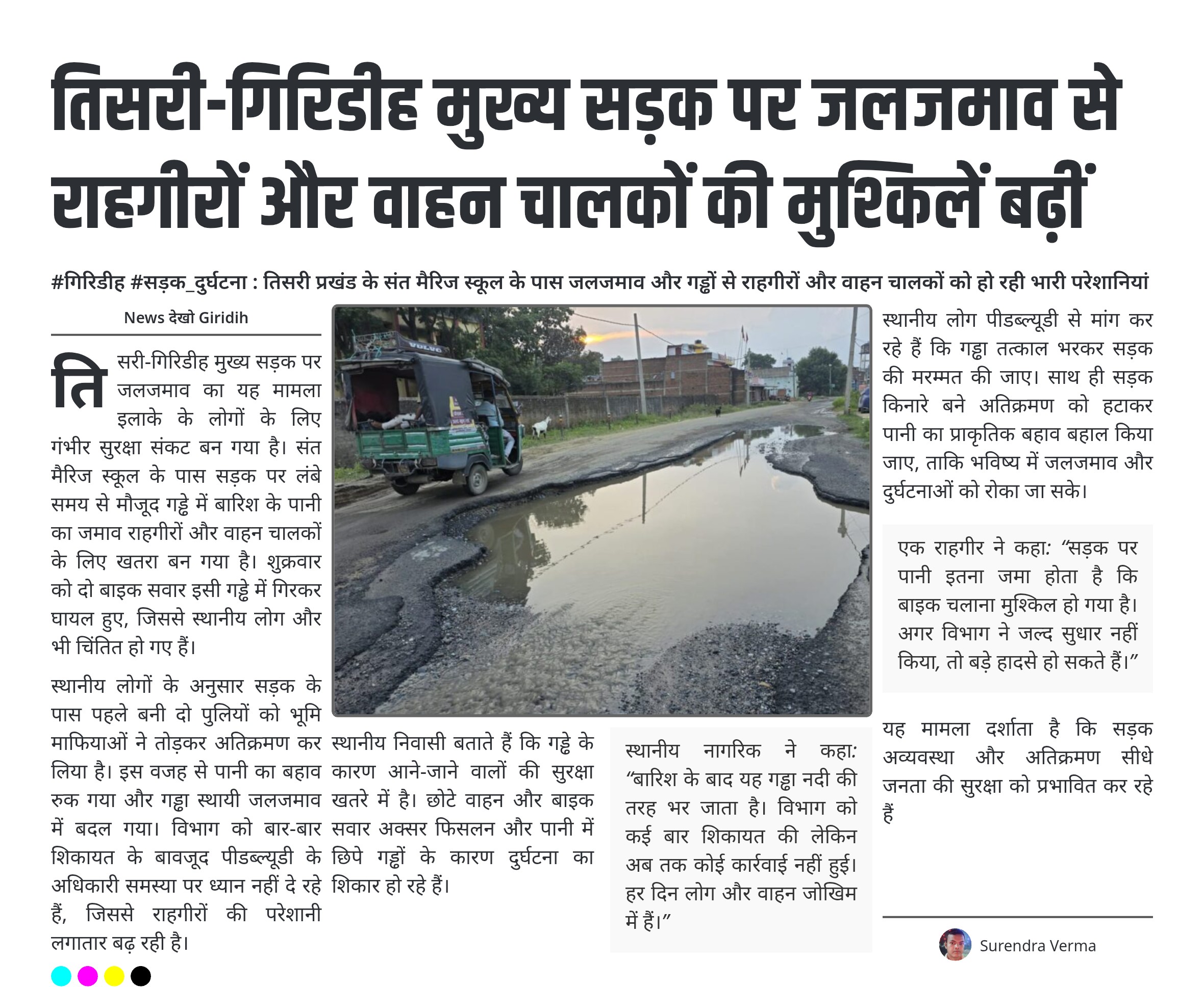 तिसरी-गिरिडीह मुख्य सड़क पर जलजमाव का यह मामला इलाके के लोगों के लिए गंभीर सुरक्षा संकट बन गया है। संत मैरिज स्कूल के पास सड़क पर लंबे समय से मौजूद गड्ढे में बारिश के पानी का जमाव राहगीरों और वाहन चालकों के लिए खतरा बन गया है। शुक्रवार को दो बाइक सवार इसी गड्ढे में गिरकर घायल हुए, जिससे स्थानीय लोग और भी चिंतित हो गए हैं।