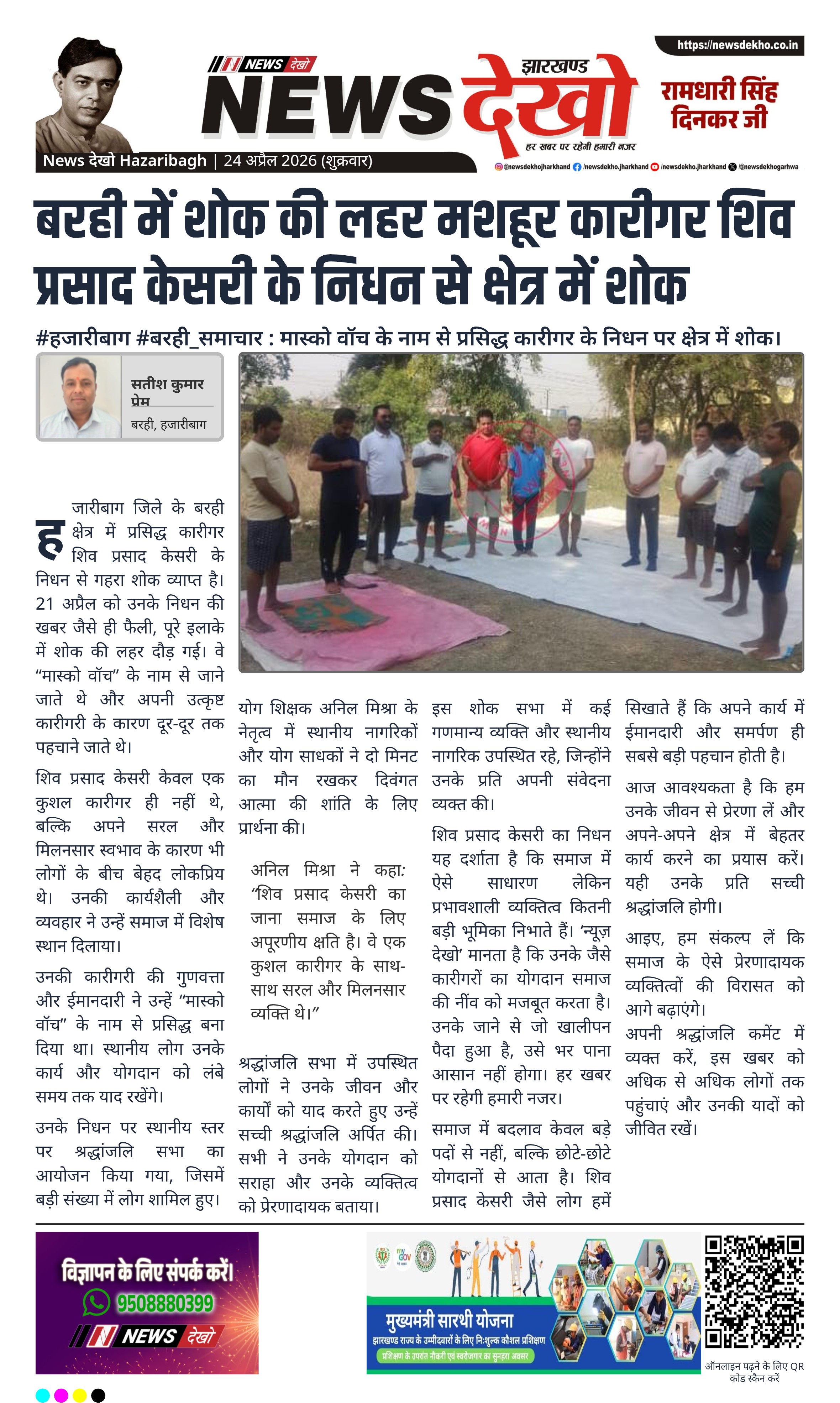 हजारीबाग के बरही क्षेत्र में प्रसिद्ध कारीगर शिव प्रसाद केसरी के निधन से शोक की लहर फैल गई है। 21 अप्रैल को उनके निधन के बाद स्थानीय लोगों और योग साधकों ने श्रद्धांजलि सभा आयोजित की। योग शिक्षक अनिल मिश्रा के नेतृत्व में लोगों ने दो मिनट का मौन रखकर उन्हें श्रद्धांजलि दी। उनका जाना क्षेत्र के लिए अपूरणीय क्षति माना जा रहा है।