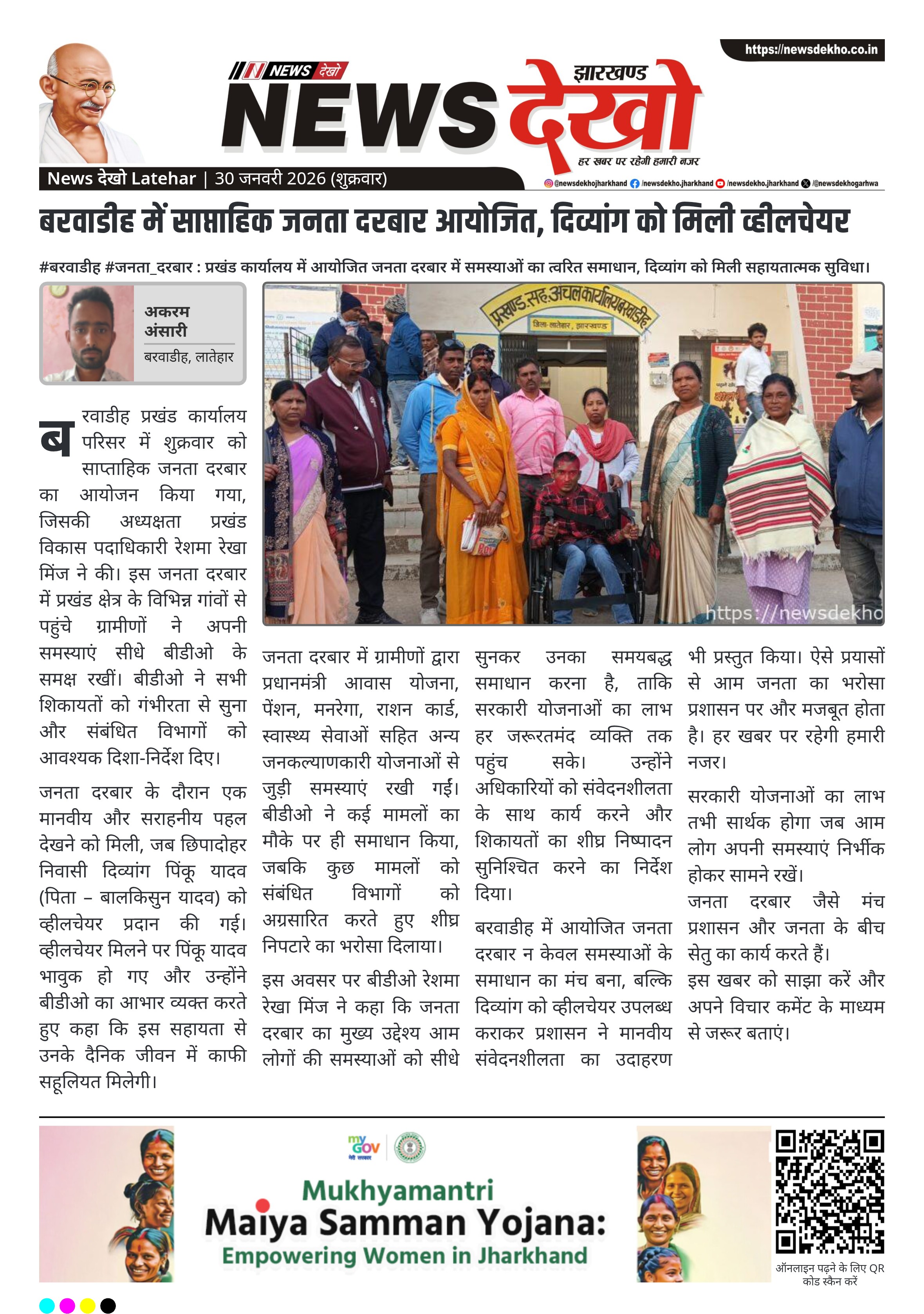 बरवाडीह में आयोजित जनता दरबार न केवल समस्याओं के समाधान का मंच बना, बल्कि दिव्यांग को व्हीलचेयर उपलब्ध कराकर प्रशासन ने मानवीय संवेदनशीलता का उदाहरण भी प्रस्तुत किया। ऐसे प्रयासों से आम जनता का भरोसा प्रशासन पर और मजबूत होता है। हर खबर पर रहेगी हमारी नजर।