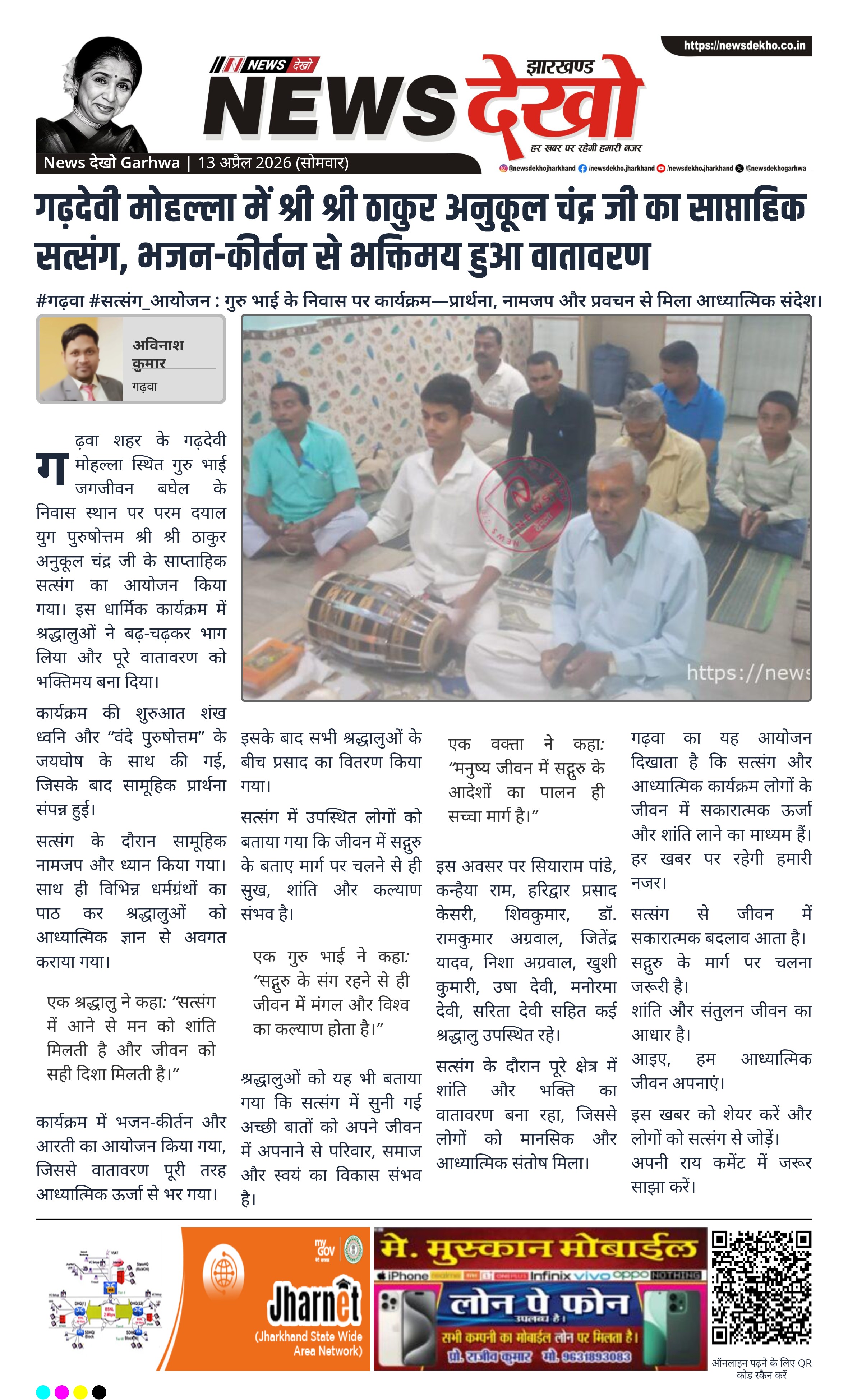 गढ़वा के गढ़देवी मोहल्ला में साप्ताहिक सत्संग का आयोजन किया गया। इसमें सामूहिक प्रार्थना, नामजप और भजन-कीर्तन हुआ। सत्संग में आध्यात्मिक जीवन और सद्गुरु के मार्ग पर चलने का संदेश दिया गया। कार्यक्रम में कई श्रद्धालु शामिल हुए।