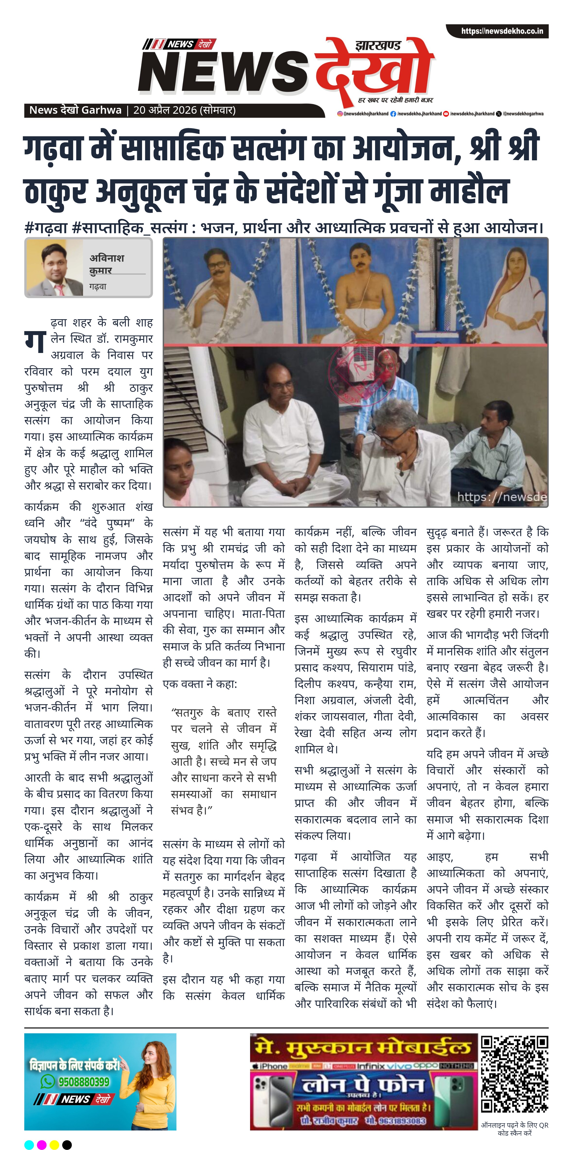 गढ़वा में आयोजित यह साप्ताहिक सत्संग दिखाता है कि आध्यात्मिक कार्यक्रम आज भी लोगों को जोड़ने और जीवन में सकारात्मकता लाने का सशक्त माध्यम हैं। ऐसे आयोजन न केवल धार्मिक आस्था को मजबूत करते हैं, बल्कि समाज में नैतिक मूल्यों और पारिवारिक संबंधों को भी सुदृढ़ बनाते हैं। जरूरत है कि इस प्रकार के आयोजनों को और व्यापक बनाया जाए, ताकि अधिक से अधिक लोग इससे लाभान्वित हो सकें। हर खबर पर रहेगी हमारी नजर।
