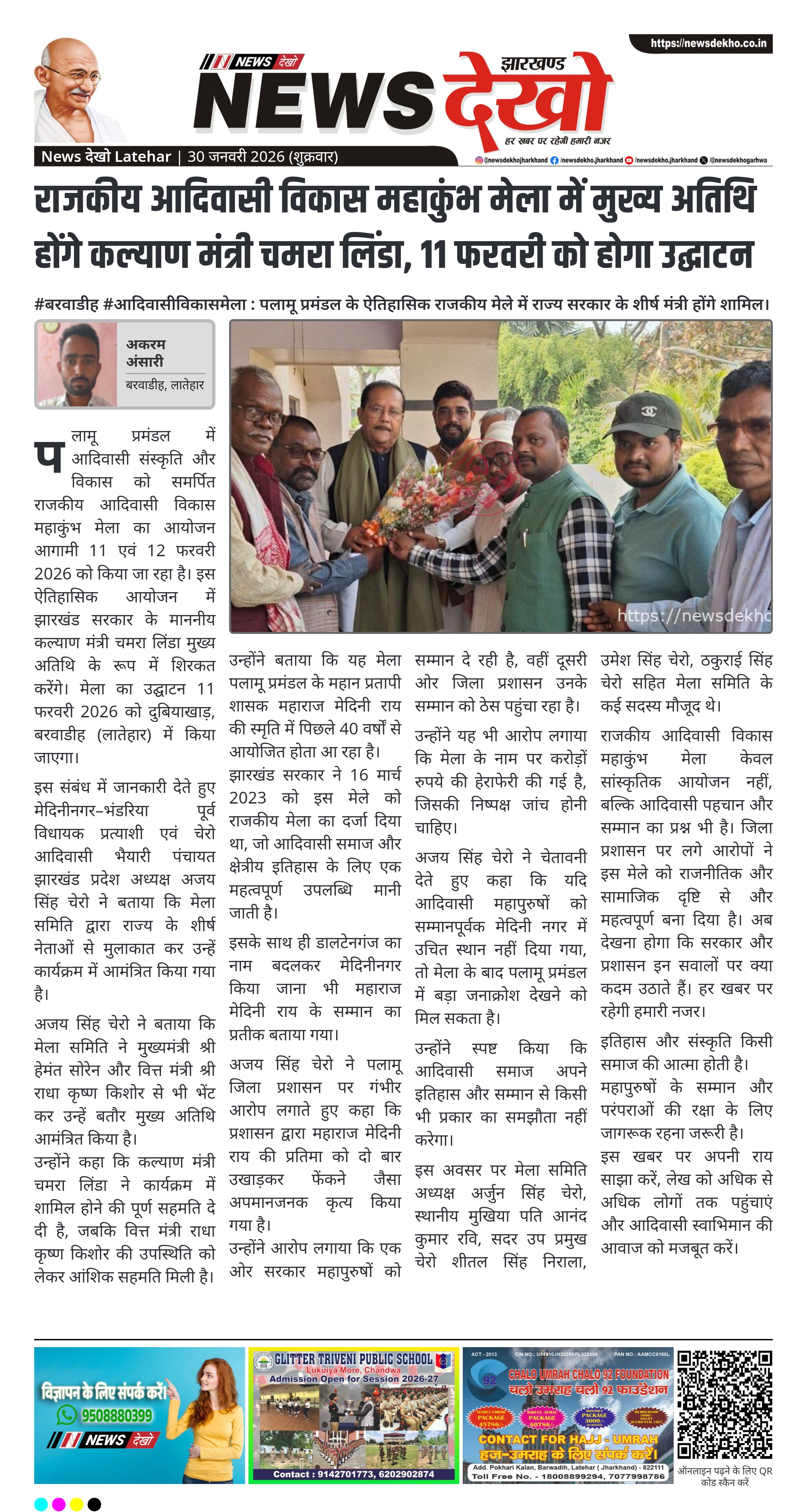 पलामू प्रमंडल में 11 और 12 फरवरी 2026 को आयोजित होने वाले राजकीय आदिवासी विकास महाकुंभ मेला को लेकर तैयारियां तेज हो गई हैं। झारखंड सरकार के माननीय कल्याण मंत्री चमरा लिंडा इस मेले में मुख्य अतिथि के रूप में शामिल होंगे और 11 फरवरी को विधिवत उद्घाटन करेंगे। मेला आदिवासी संस्कृति, इतिहास और विकास से जुड़े मुद्दों को एक मंच पर लाने वाला महत्वपूर्ण आयोजन माना जा रहा है। यह मेला क्षेत्रीय पहचान और आदिवासी स्वाभिमान का प्रतीक बन चुका है।