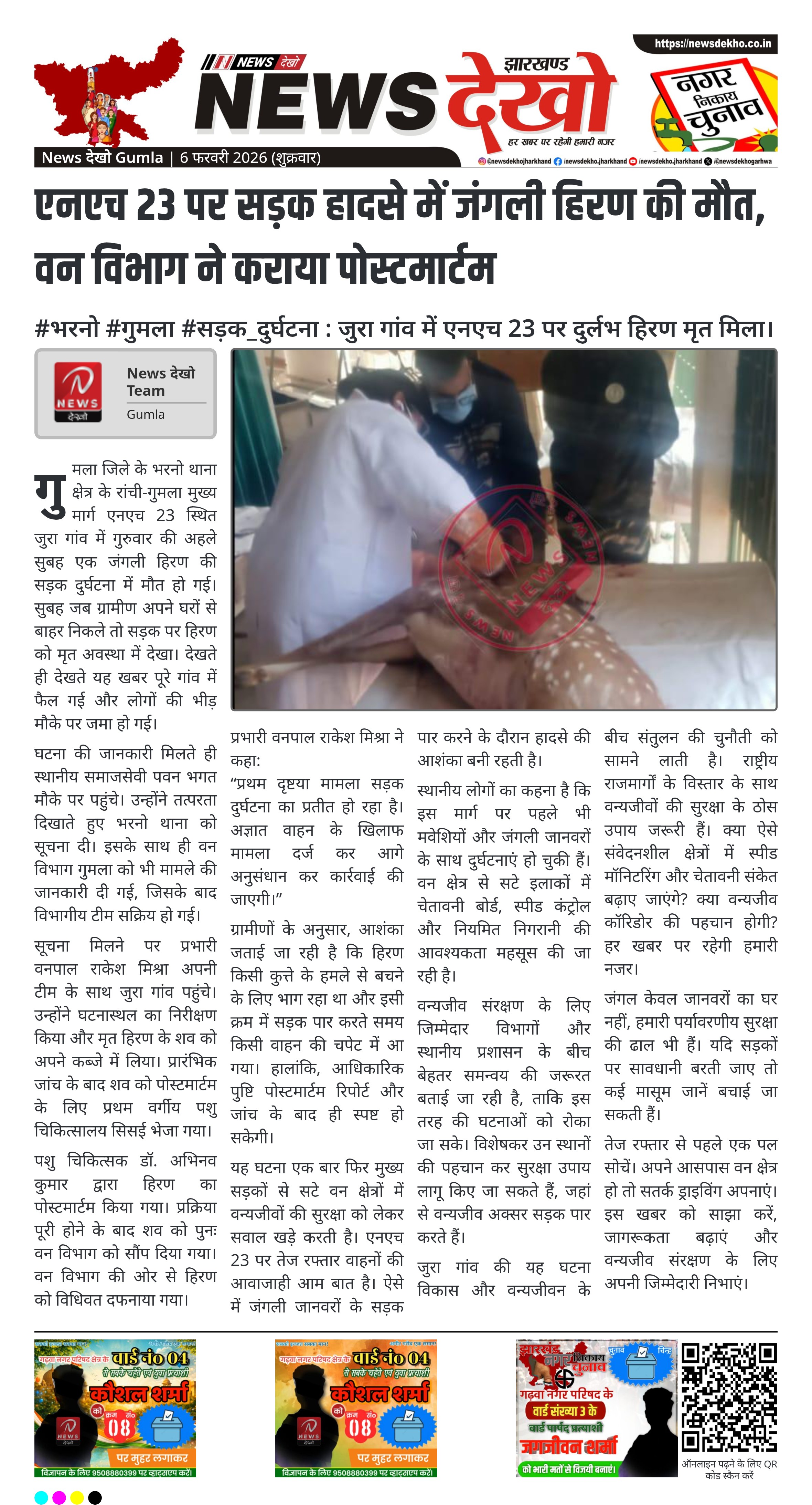 गुमला जिले के भरनो थाना क्षेत्र के रांची-गुमला मुख्य मार्ग एनएच 23 स्थित जुरा गांव में गुरुवार की अहले सुबह एक जंगली हिरण की सड़क दुर्घटना में मौत हो गई। सुबह जब ग्रामीण अपने घरों से बाहर निकले तो सड़क पर हिरण को मृत अवस्था में देखा। देखते ही देखते यह खबर पूरे गांव में फैल गई और लोगों की भीड़ मौके पर जमा हो गई।