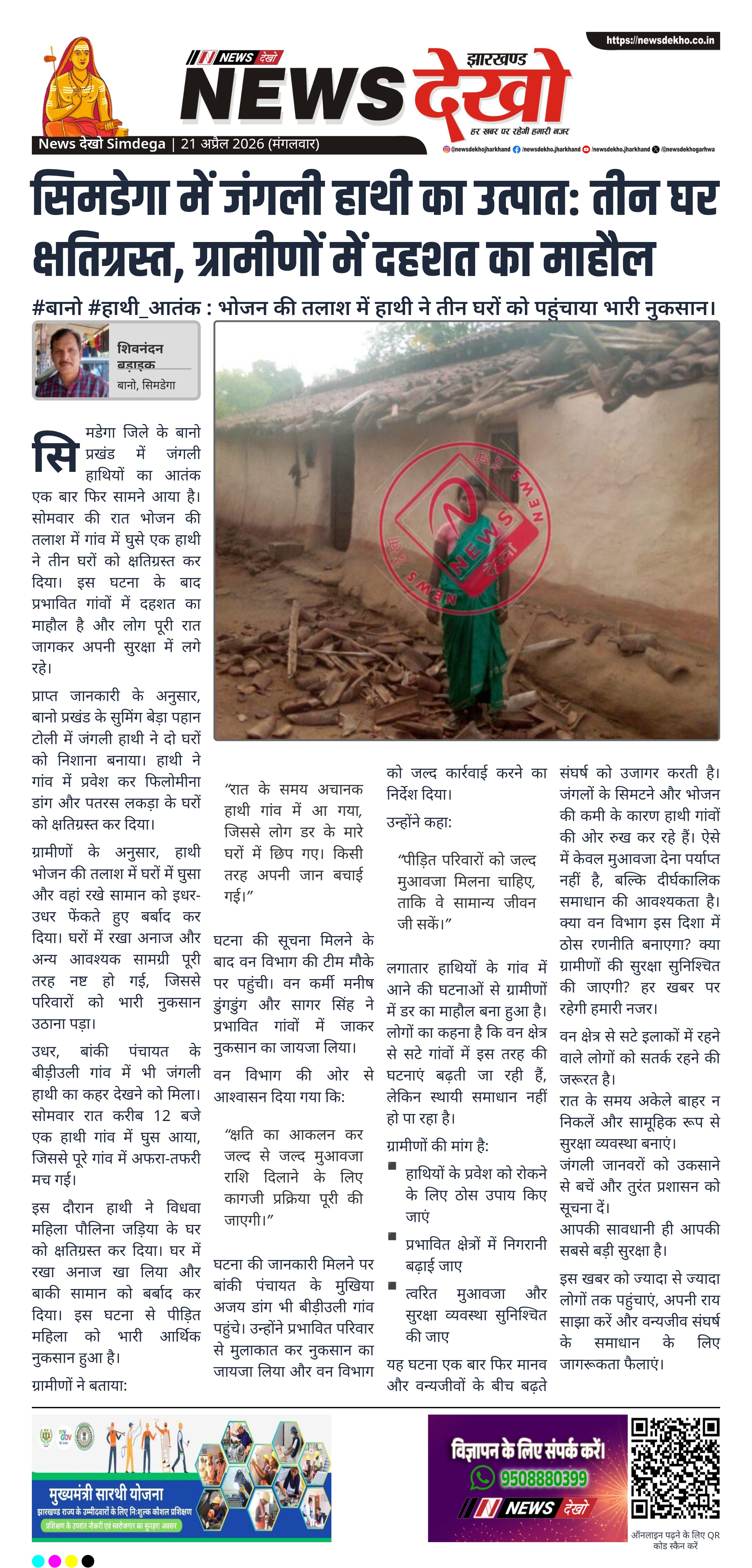घटना की जानकारी मिलने पर बांकी पंचायत के मुखिया अजय डांग भी बीड़ीउली गांव पहुंचे। उन्होंने प्रभावित परिवार से मुलाकात कर नुकसान का जायजा लिया और वन विभाग को जल्द कार्रवाई करने का निर्देश दिया।