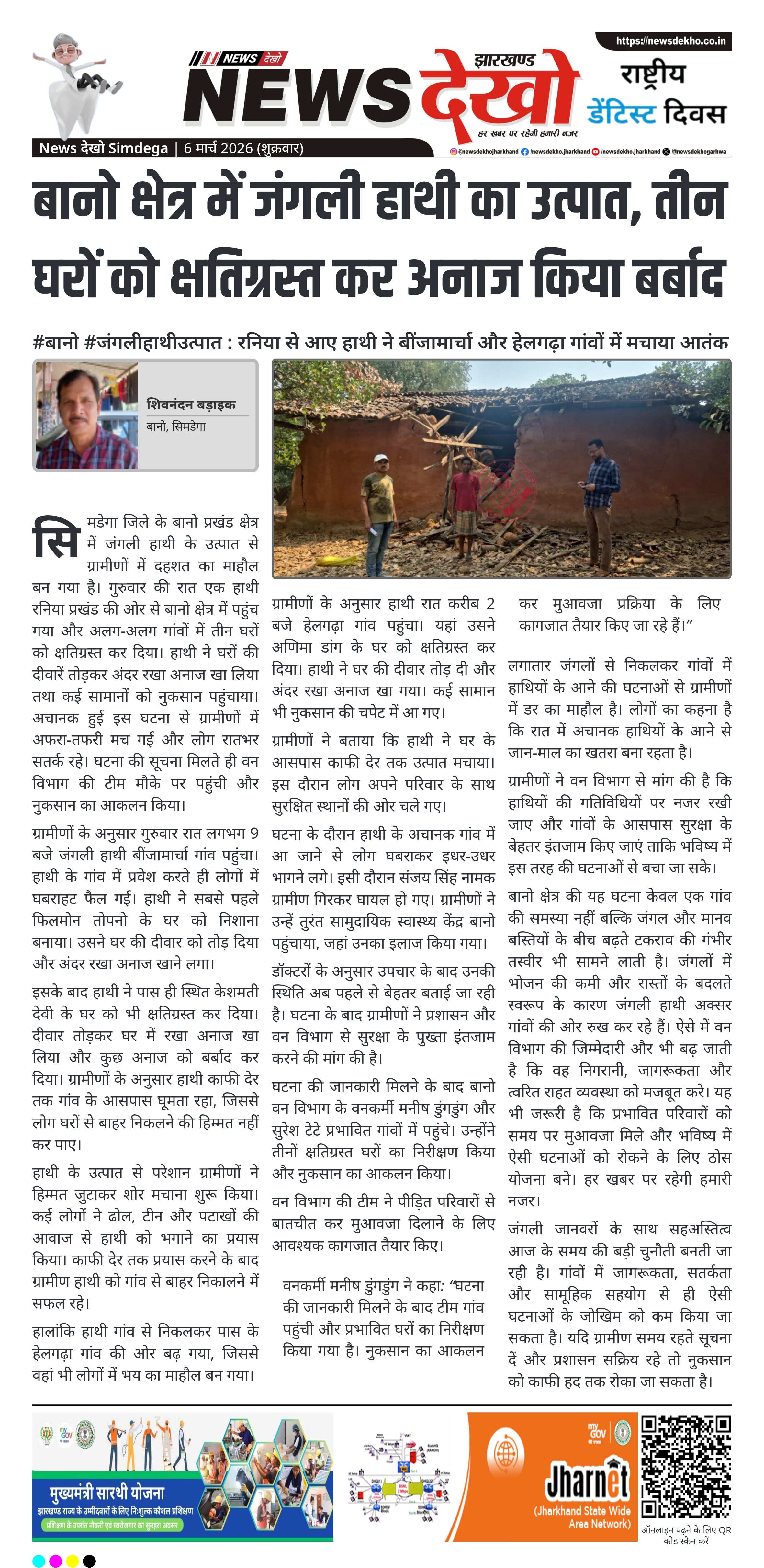 - बानो प्रखंड के बींजामार्चा और हेलगढ़ा गांव में जंगली हाथी ने तीन घरों को क्षतिग्रस्त किया।