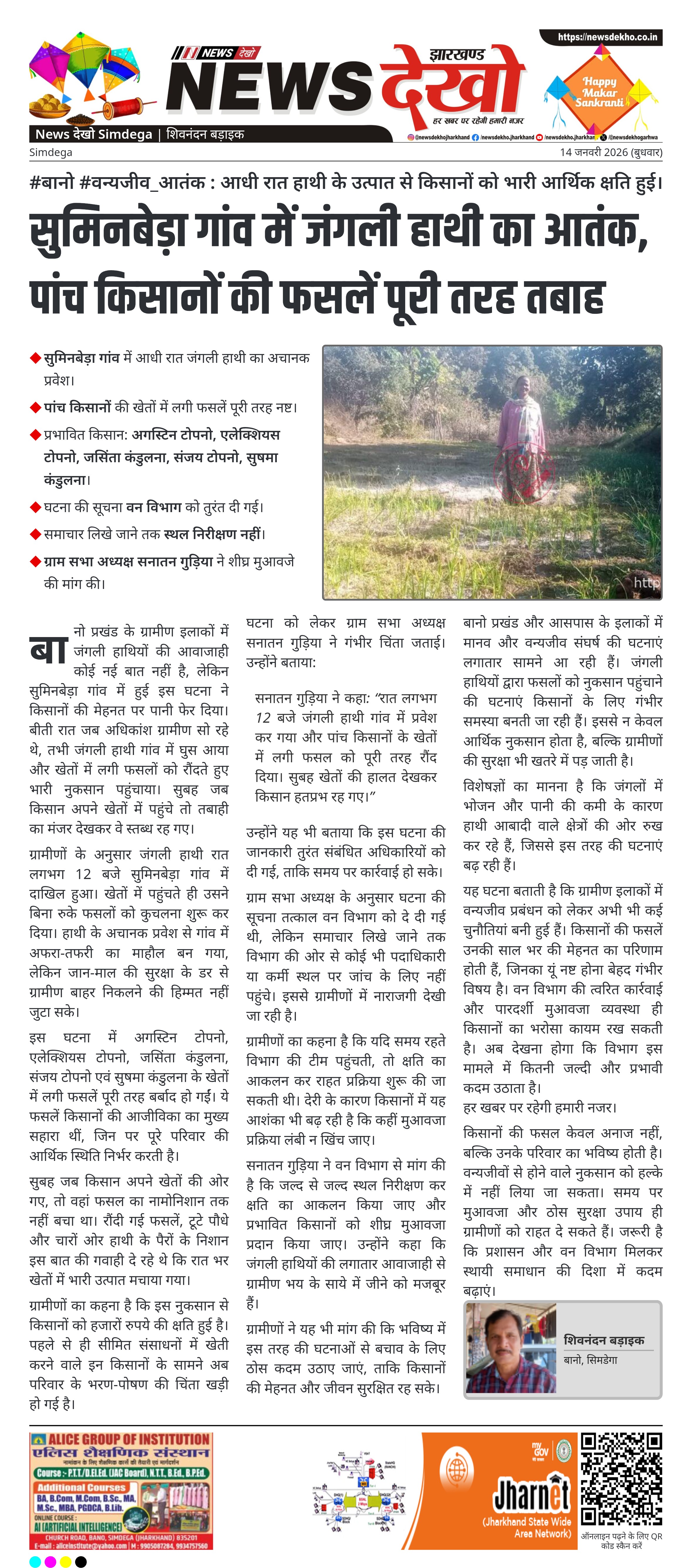 सनातन गुड़िया ने वन विभाग से मांग की है कि जल्द से जल्द स्थल निरीक्षण कर क्षति का आकलन किया जाए और प्रभावित किसानों को शीघ्र मुआवजा प्रदान किया जाए। उन्होंने कहा कि जंगली हाथियों की लगातार आवाजाही से ग्रामीण भय के साये में जीने को मजबूर हैं।