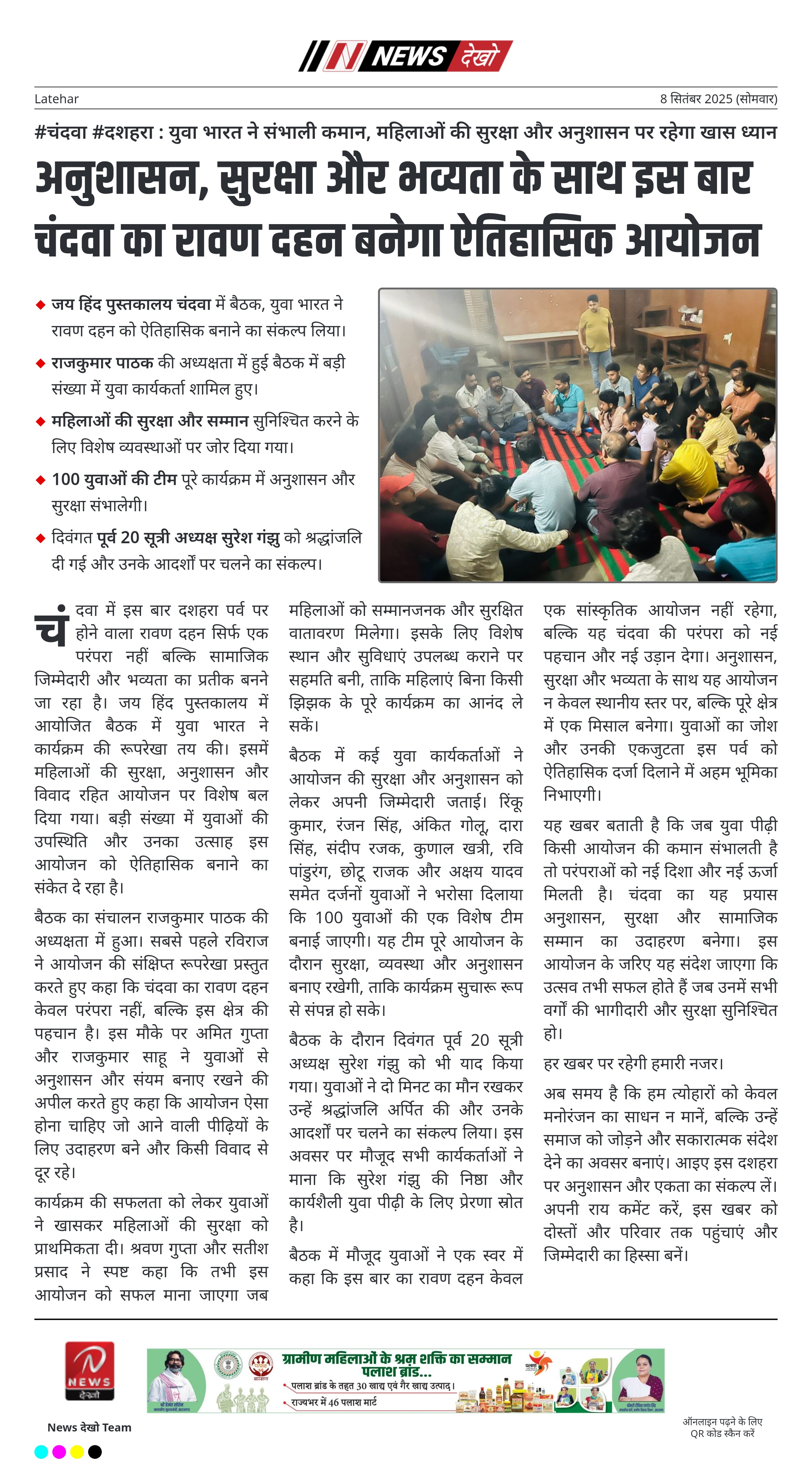 • जय हिंद पुस्तकालय चंदवा में बैठक, युवा भारत ने रावण दहन को ऐतिहासिक बनाने का संकल्प लिया।
