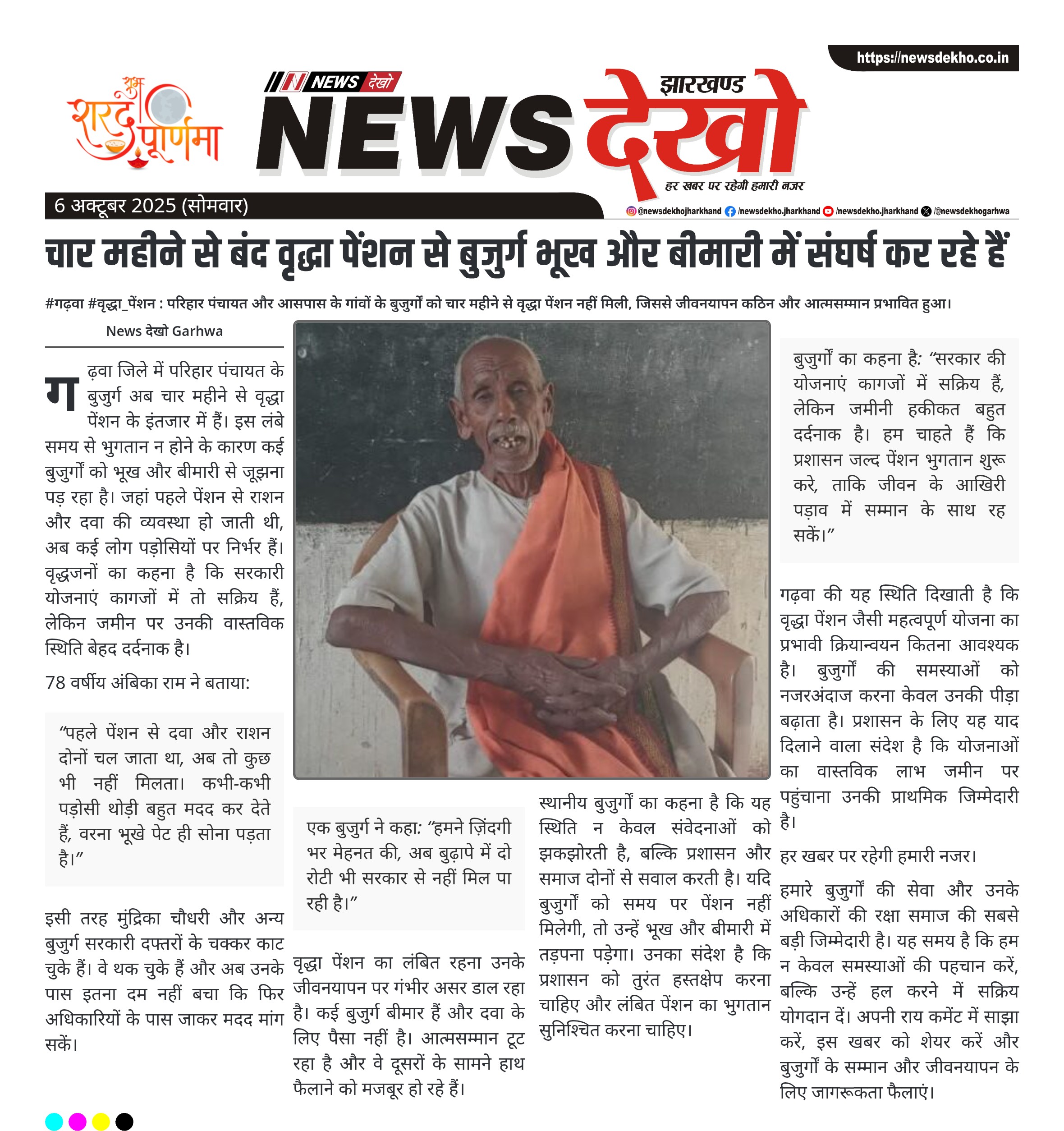 गढ़वा की यह स्थिति दिखाती है कि वृद्धा पेंशन जैसी महत्वपूर्ण योजना का प्रभावी क्रियान्वयन कितना आवश्यक है। बुजुर्गों की समस्याओं को नजरअंदाज करना केवल उनकी पीड़ा बढ़ाता है। प्रशासन के लिए यह याद दिलाने वाला संदेश है कि योजनाओं का वास्तविक लाभ जमीन पर पहुंचाना उनकी प्राथमिक जिम्मेदारी है।
