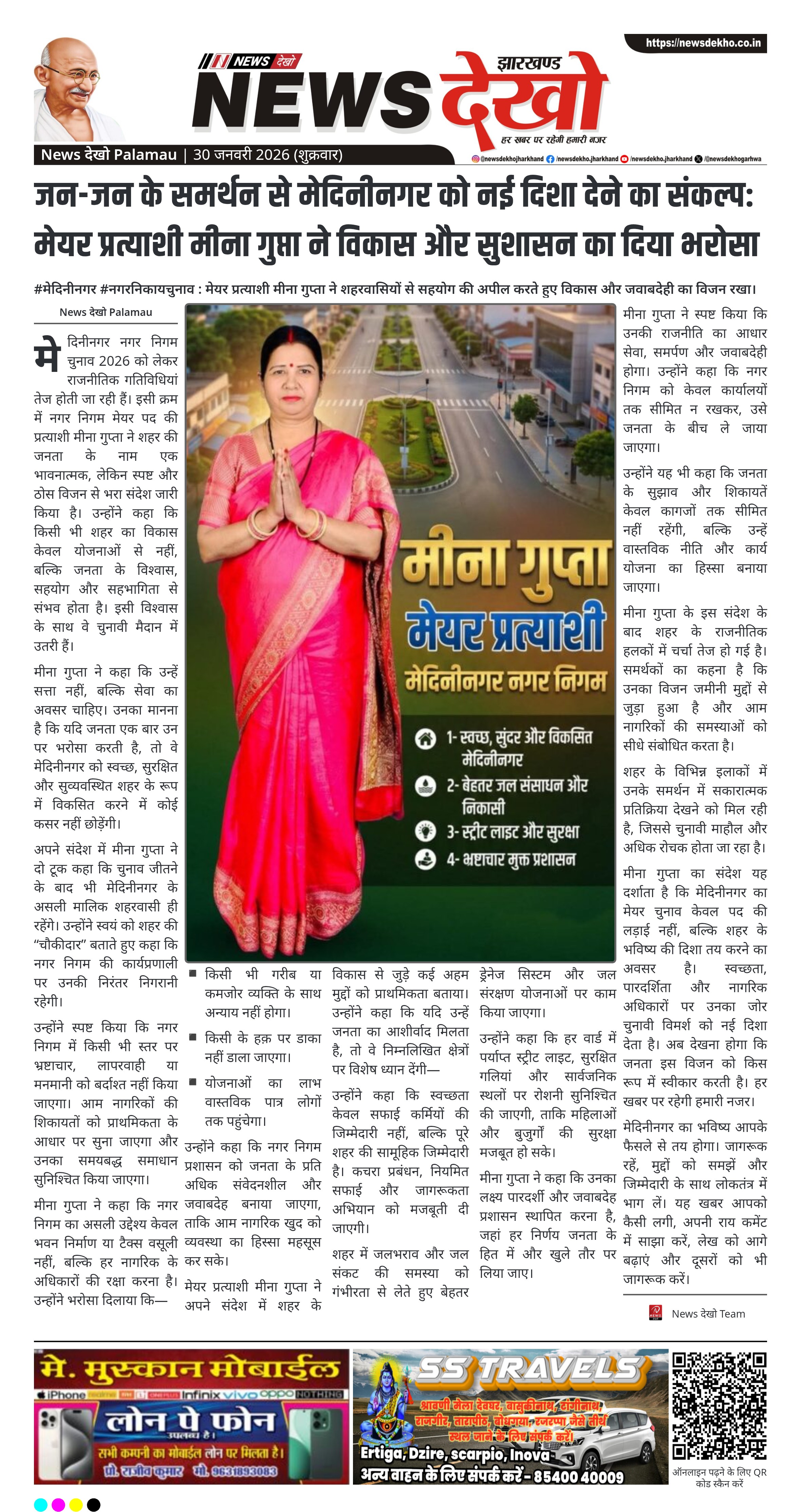 मीना गुप्ता का संदेश यह दर्शाता है कि मेदिनीनगर का मेयर चुनाव केवल पद की लड़ाई नहीं, बल्कि शहर के भविष्य की दिशा तय करने का अवसर है। स्वच्छता, पारदर्शिता और नागरिक अधिकारों पर उनका जोर चुनावी विमर्श को नई दिशा देता है। अब देखना होगा कि जनता इस विजन को किस रूप में स्वीकार करती है। हर खबर पर रहेगी हमारी नजर।