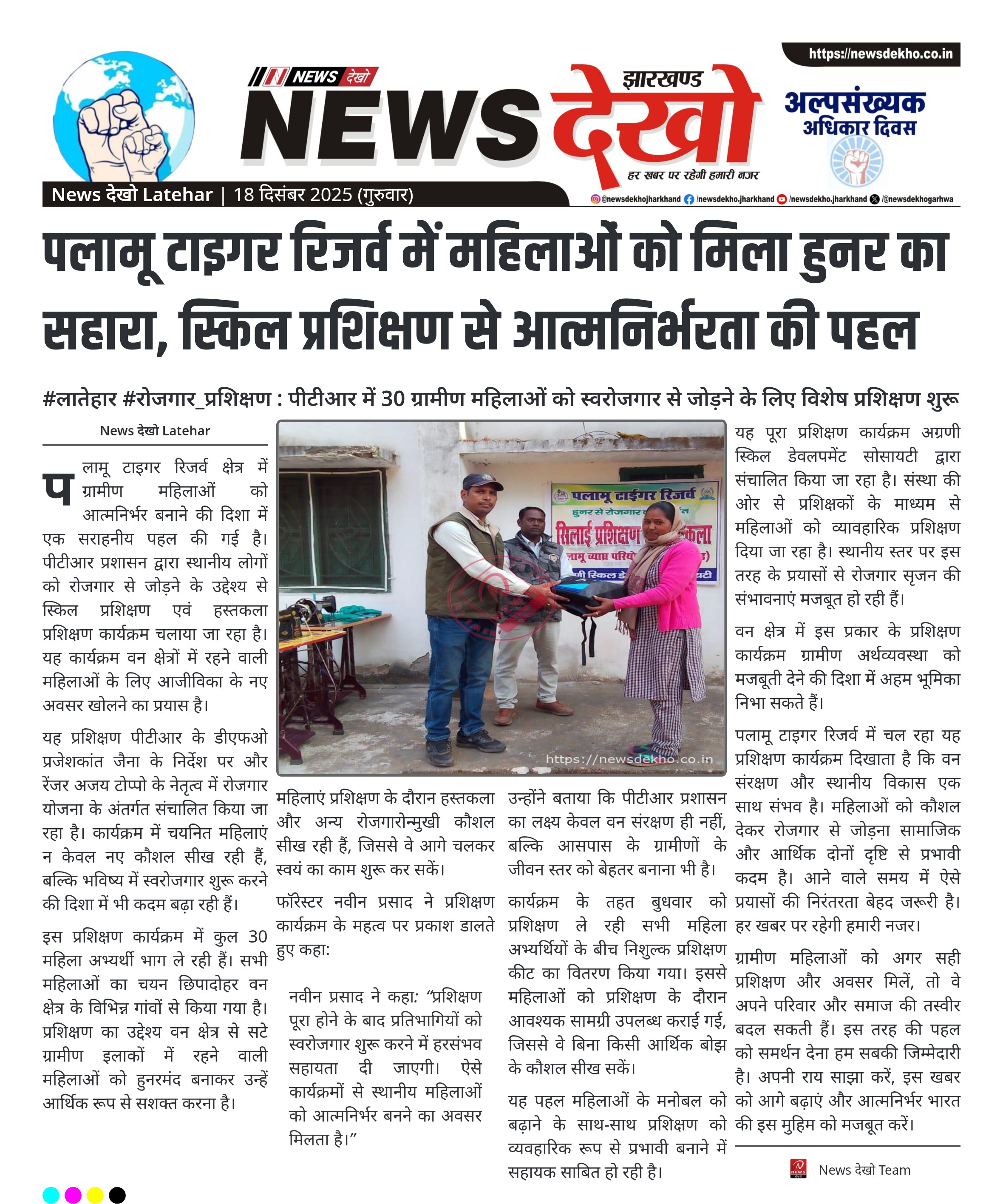 पलामू टाइगर रिजर्व क्षेत्र में स्थानीय महिलाओं को आत्मनिर्भर बनाने के उद्देश्य से स्किल एवं हस्तकला प्रशिक्षण कार्यक्रम संचालित किया जा रहा है। डीएफओ के निर्देश पर शुरू इस पहल में छिपादोहर वन क्षेत्र की 30 महिला अभ्यर्थी भाग ले रही हैं। प्रशिक्षण का लक्ष्य रोजगार से जोड़कर महिलाओं की आर्थिक स्थिति मजबूत करना है। कार्यक्रम स्थानीय स्तर पर आजीविका सृजन की दिशा में एक महत्वपूर्ण कदम माना जा रहा है।