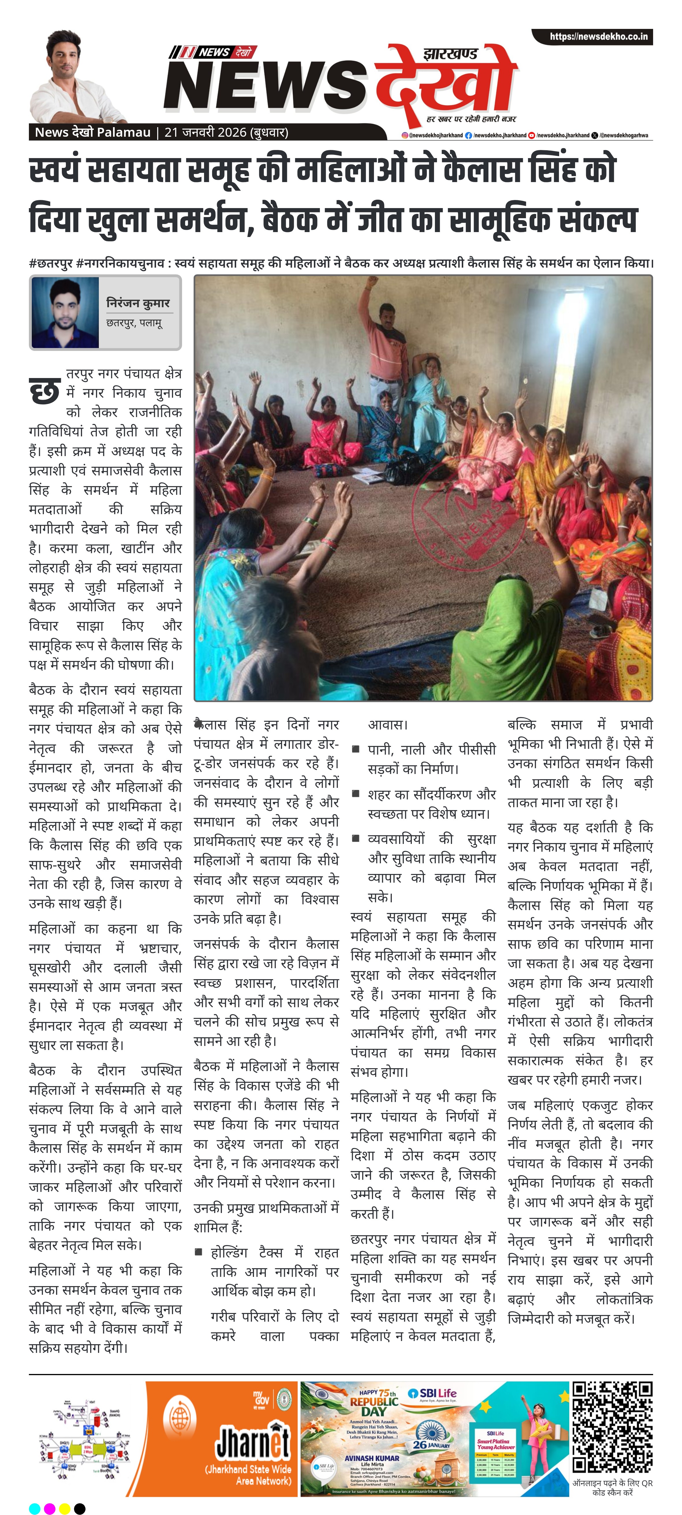 बैठक के दौरान स्वयं सहायता समूह की महिलाओं ने कहा कि नगर पंचायत क्षेत्र को अब ऐसे नेतृत्व की जरूरत है जो ईमानदार हो, जनता के बीच उपलब्ध रहे और महिलाओं की समस्याओं को प्राथमिकता दे। महिलाओं ने स्पष्ट शब्दों में कहा कि कैलास सिंह की छवि एक साफ-सुथरे और समाजसेवी नेता की रही है, जिस कारण वे उनके साथ खड़ी हैं।