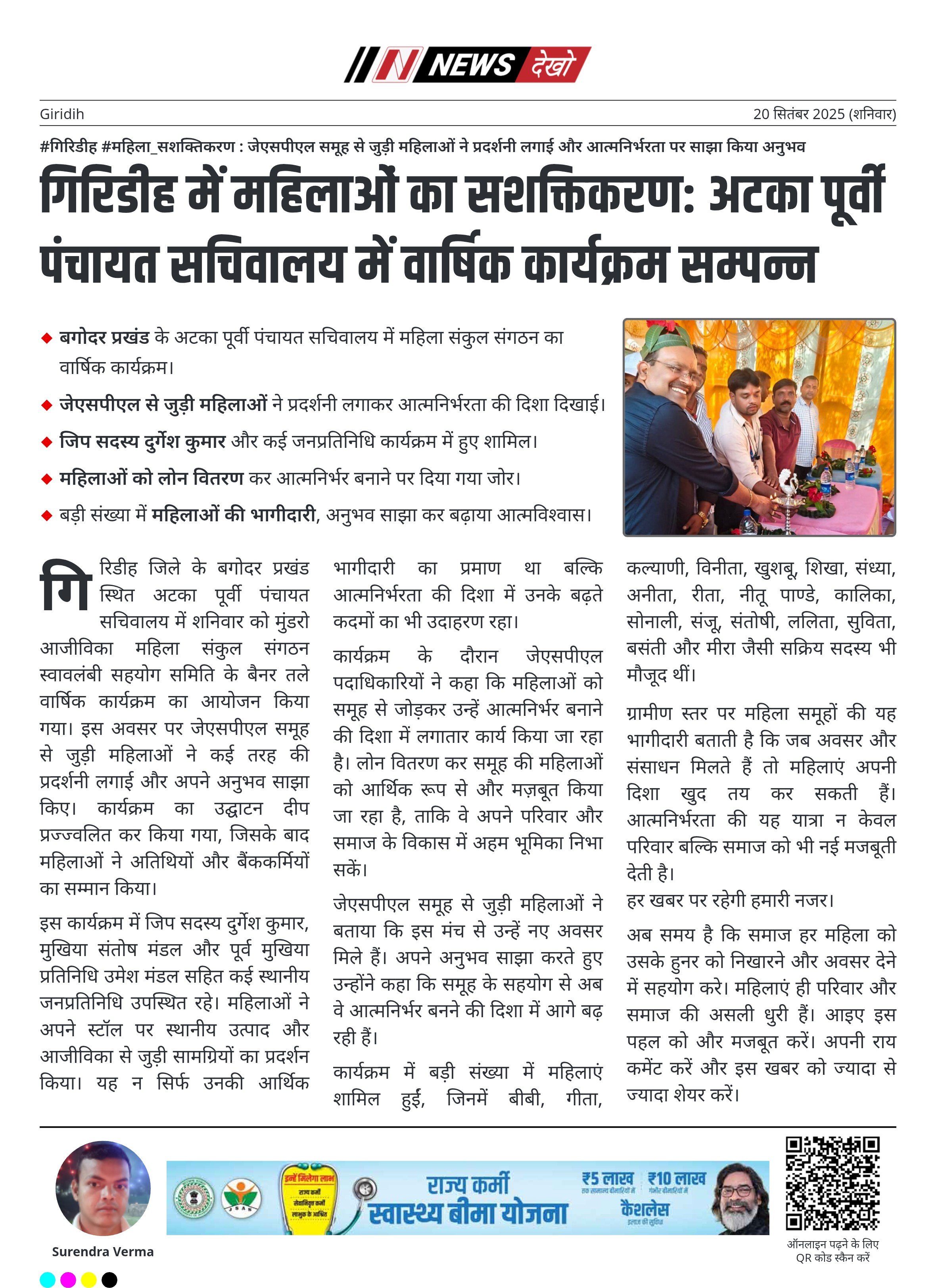 गिरिडीह जिले के बगोदर प्रखंड स्थित अटका पूर्वी पंचायत सचिवालय में शनिवार को मुंडरो आजीविका महिला संकुल संगठन स्वावलंबी सहयोग समिति के बैनर तले वार्षिक कार्यक्रम का आयोजन किया गया। इस अवसर पर जेएसपीएल समूह से जुड़ी महिलाओं ने कई तरह की प्रदर्शनी लगाई और अपने अनुभव साझा किए। कार्यक्रम का उद्घाटन दीप प्रज्ज्वलित कर किया गया, जिसके बाद महिलाओं ने अतिथियों और बैंककर्मियों का सम्मान किया।