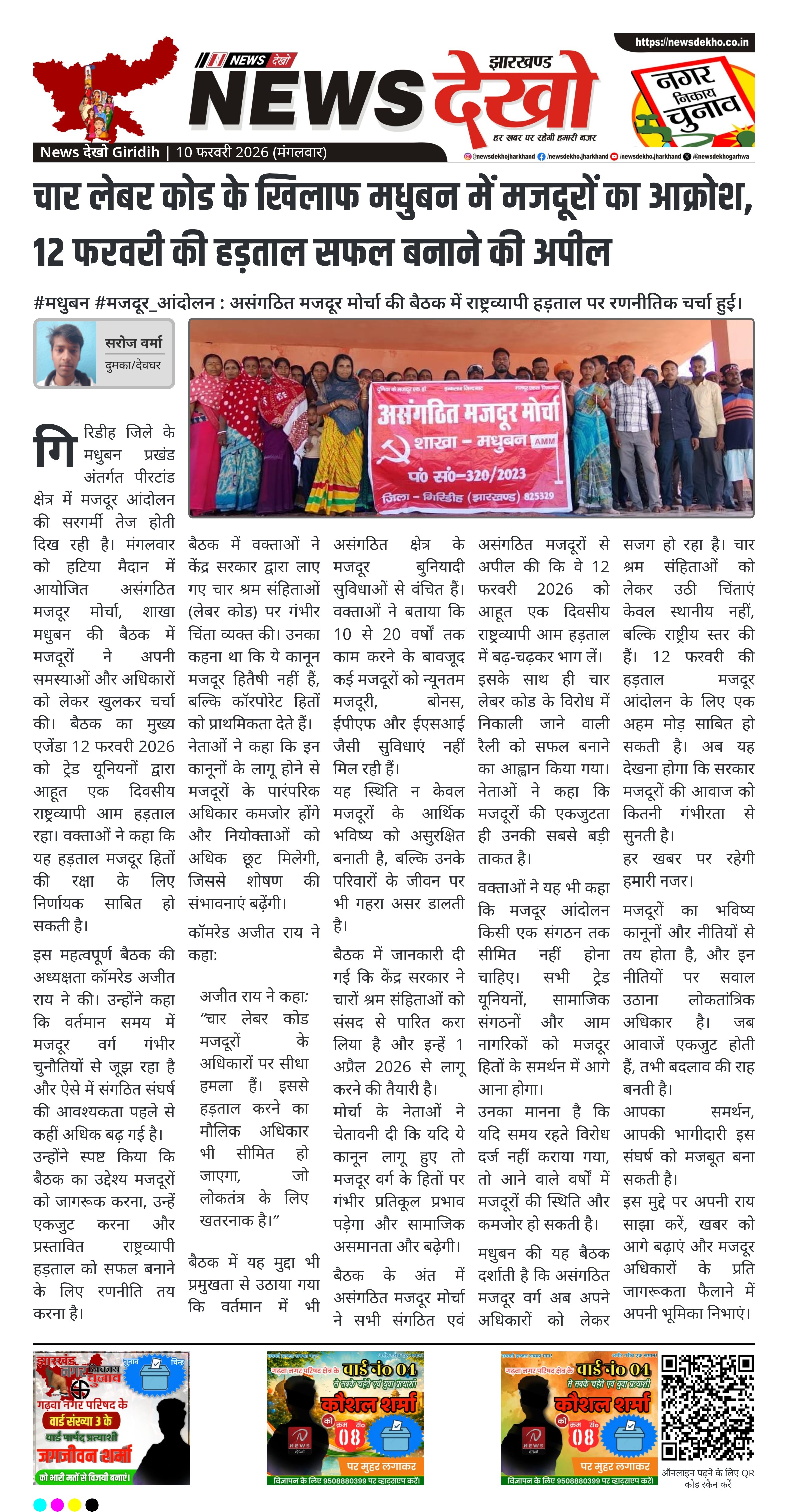 गिरिडीह जिले के मधुबन में असंगठित मजदूर मोर्चा की बैठक में 12 फरवरी 2026 को प्रस्तावित राष्ट्रव्यापी आम हड़ताल को लेकर चर्चा हुई। बैठक में केंद्र सरकार के चार श्रम संहिताओं के विरोध में मजदूरों ने अपनी चिंताएं रखीं। नेताओं ने कहा कि नए कानून मजदूर अधिकारों को कमजोर करेंगे। हड़ताल को सफल बनाने के लिए संगठित प्रयास का आह्वान किया गया।