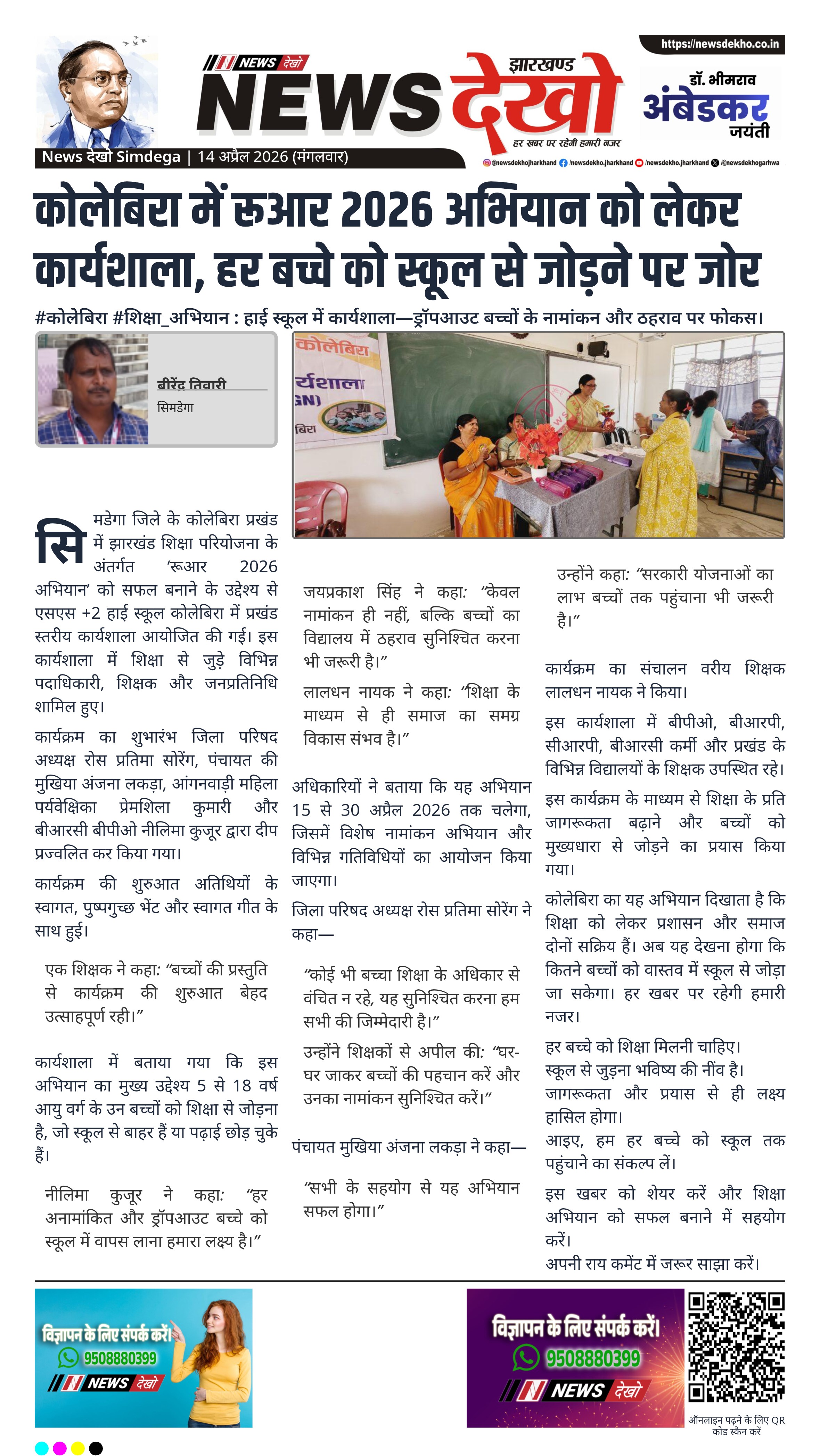 सिमडेगा के कोलेबिरा में रूआर 2026 अभियान को लेकर प्रखंड स्तरीय कार्यशाला आयोजित की गई। इसमें 5 से 18 वर्ष के बच्चों को स्कूल से जोड़ने पर जोर दिया गया। जनप्रतिनिधियों और शिक्षकों से सहयोग की अपील की गई। अभियान 15 से 30 अप्रैल तक चलेगा।