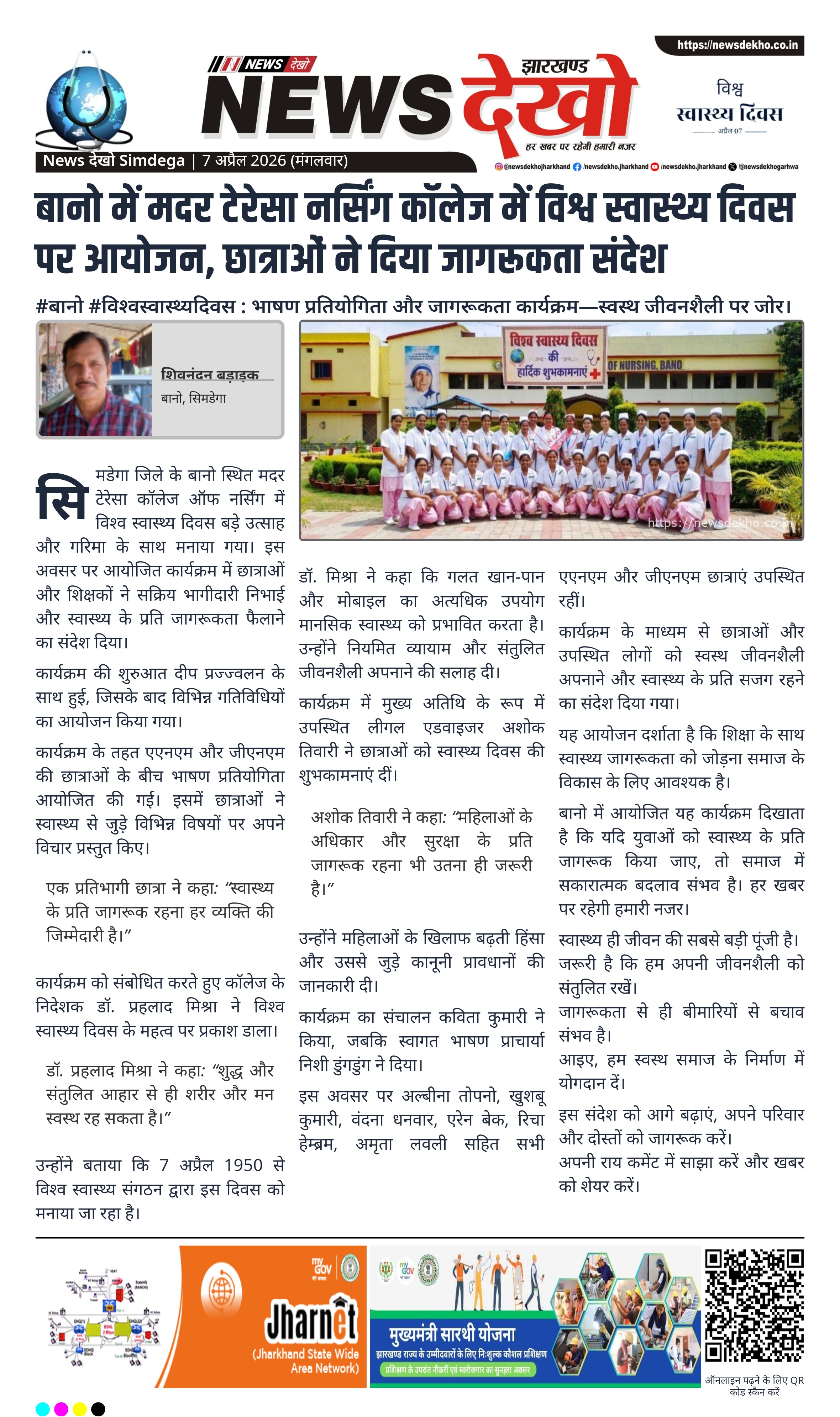 सिमडेगा जिले के बानो स्थित मदर टेरेसा कॉलेज ऑफ नर्सिंग में विश्व स्वास्थ्य दिवस बड़े उत्साह और गरिमा के साथ मनाया गया। इस अवसर पर आयोजित कार्यक्रम में छात्राओं और शिक्षकों ने सक्रिय भागीदारी निभाई और स्वास्थ्य के प्रति जागरूकता फैलाने का संदेश दिया।