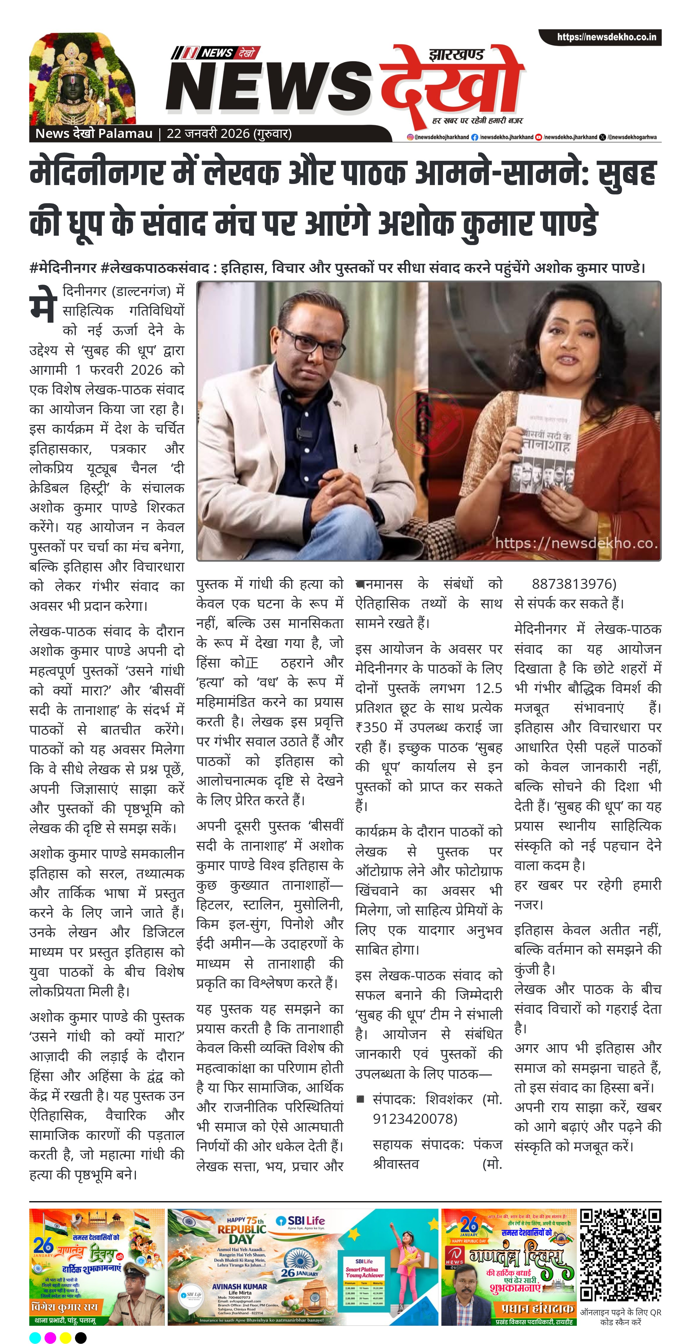 मेदिनीनगर में 1 फरवरी 2026 को साहित्य और इतिहास प्रेमियों के लिए एक विशेष अवसर आने वाला है, जब पत्रिका सुबह की धूप द्वारा लेखक-पाठक संवाद का आयोजन किया जाएगा। इस कार्यक्रम में प्रसिद्ध इतिहासकार, पत्रकार और यूट्यूब चैनल ‘दी क्रेडिबल हिस्ट्री’ के संचालक अशोक कुमार पाण्डे अपनी चर्चित पुस्तकों के संदर्भ में पाठकों से सीधा संवाद करेंगे। आयोजन का उद्देश्य इतिहास, विचारधारा और समकालीन विमर्श को आम पाठकों से जोड़ना है। यह संवाद साहित्यिक जगत के लिए एक महत्वपूर्ण पहल मानी जा रही है।