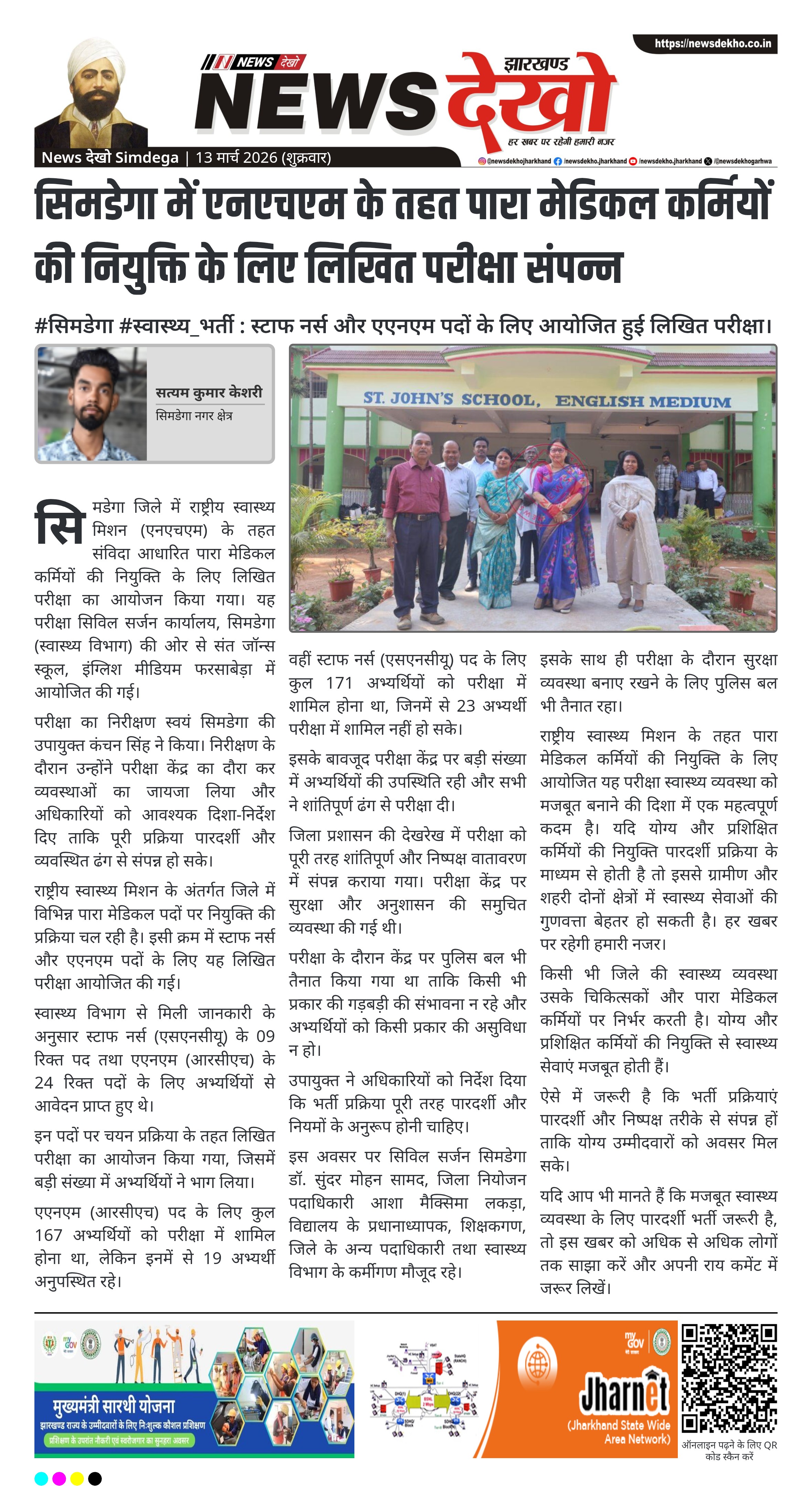 सिमडेगा जिले में राष्ट्रीय स्वास्थ्य मिशन (एनएचएम) के तहत संविदा आधारित पारा मेडिकल कर्मियों की नियुक्ति के लिए लिखित परीक्षा का आयोजन किया गया। यह परीक्षा सिविल सर्जन कार्यालय, सिमडेगा (स्वास्थ्य विभाग) की ओर से संत जॉन्स स्कूल, इंग्लिश मीडियम फरसाबेड़ा में आयोजित की गई।