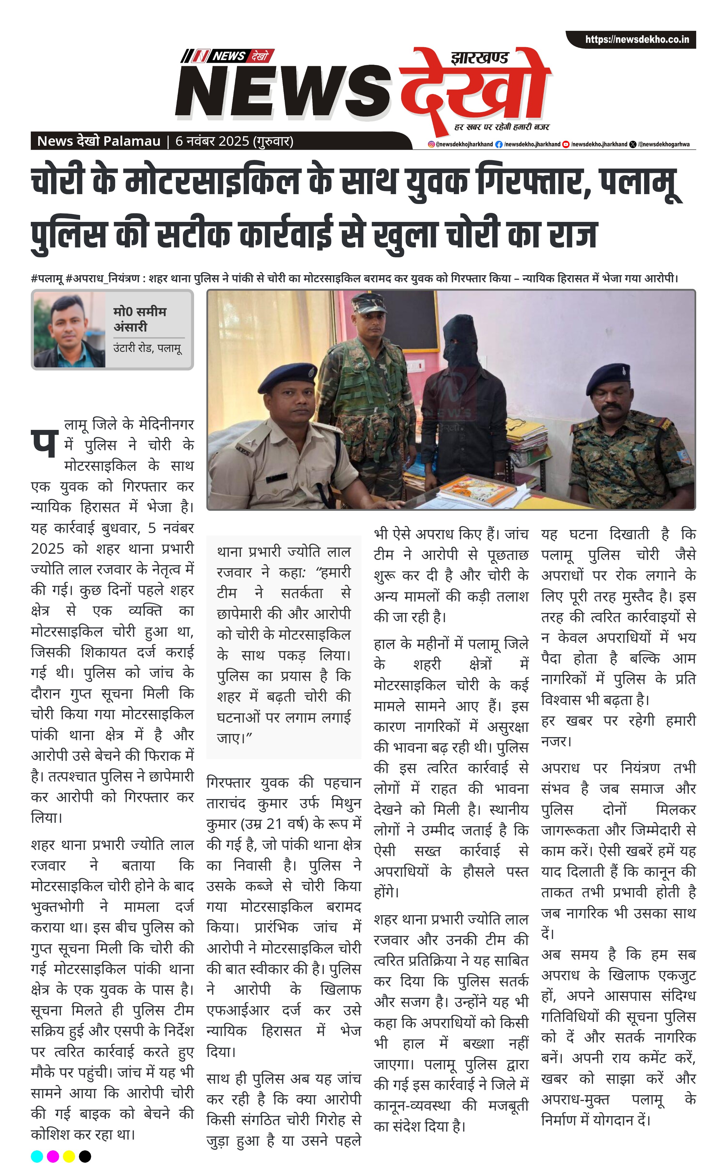 पलामू जिले के मेदिनीनगर में पुलिस ने चोरी के मोटरसाइकिल के साथ एक युवक को गिरफ्तार कर न्यायिक हिरासत में भेजा है। यह कार्रवाई बुधवार, 5 नवंबर 2025 को शहर थाना प्रभारी ज्योति लाल रजवार के नेतृत्व में की गई। कुछ दिनों पहले शहर क्षेत्र से एक व्यक्ति का मोटरसाइकिल चोरी हुआ था, जिसकी शिकायत दर्ज कराई गई थी। पुलिस को जांच के दौरान गुप्त सूचना मिली कि चोरी किया गया मोटरसाइकिल पांकी थाना क्षेत्र में है और आरोपी उसे बेचने की फिराक में है। तत्पश्चात पुलिस ने छापेमारी कर आरोपी को गिरफ्तार कर लिया।