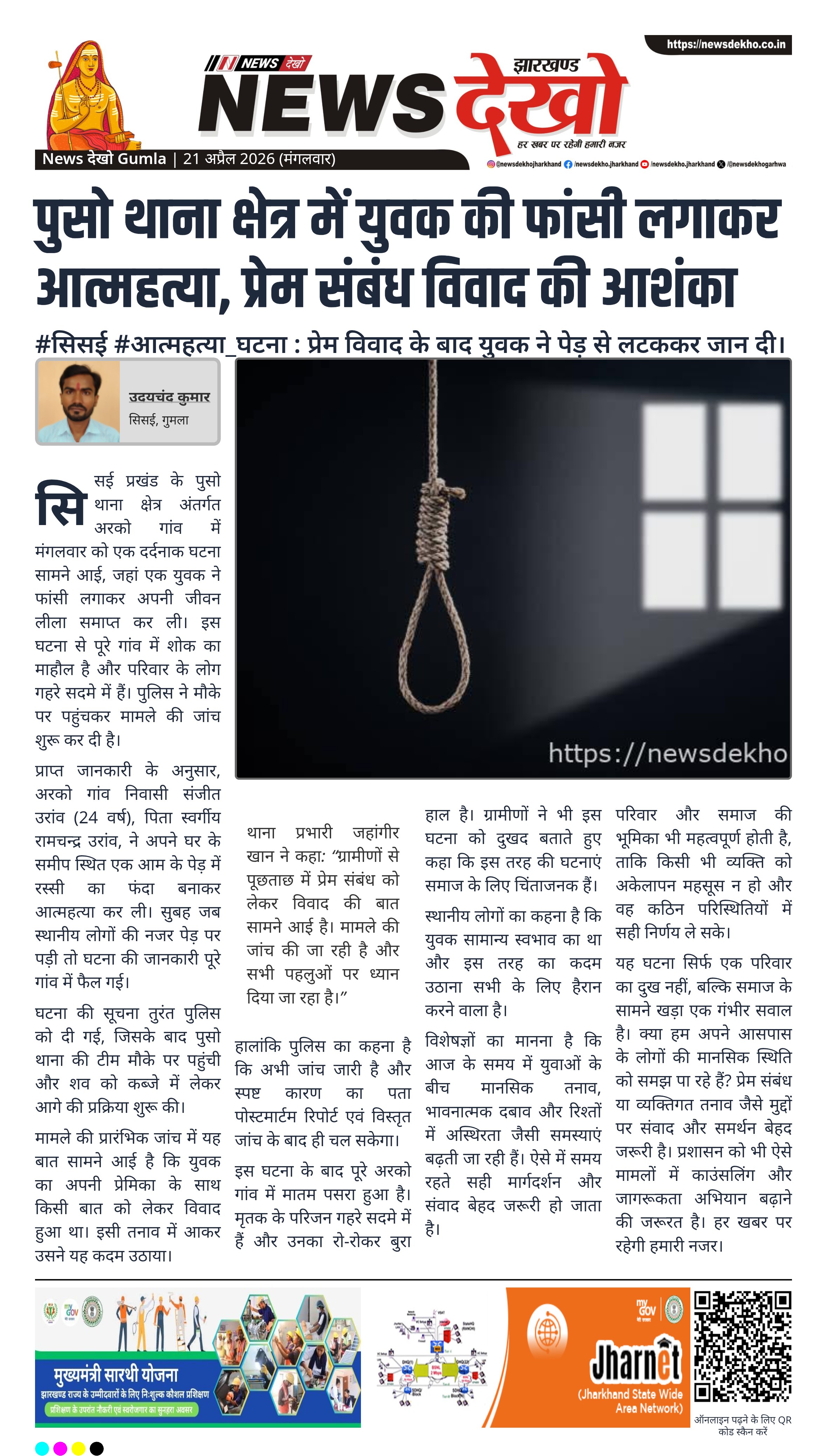 - अरको गांव के 24 वर्षीय संजीत उरांव ने की आत्महत्या।