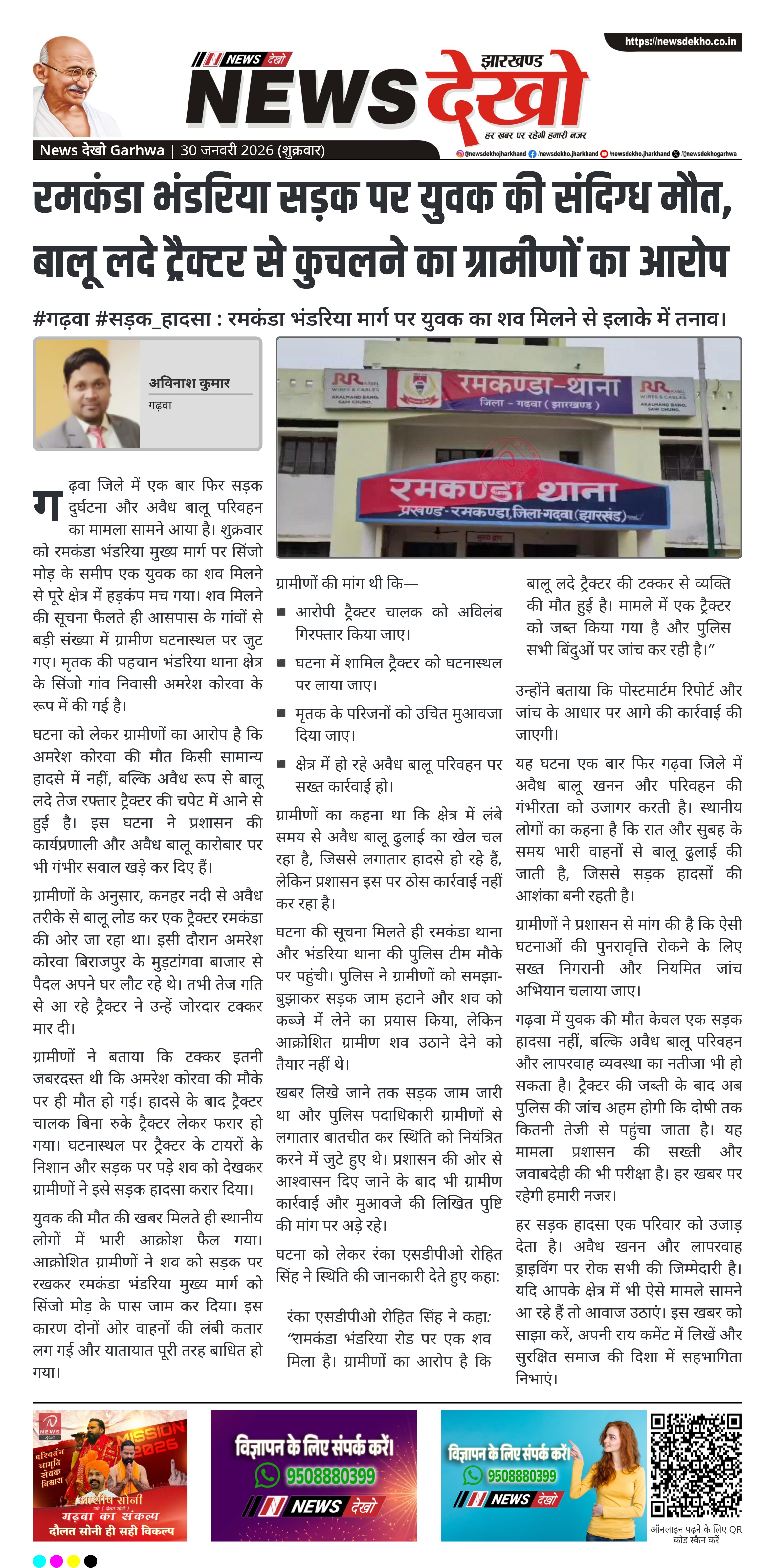 गढ़वा जिले में एक बार फिर सड़क दुर्घटना और अवैध बालू परिवहन का मामला सामने आया है। शुक्रवार को रमकंडा भंडरिया मुख्य मार्ग पर सिंजो मोड़ के समीप एक युवक का शव मिलने से पूरे क्षेत्र में हड़कंप मच गया। शव मिलने की सूचना फैलते ही आसपास के गांवों से बड़ी संख्या में ग्रामीण घटनास्थल पर जुट गए। मृतक की पहचान भंडरिया थाना क्षेत्र के सिंजो गांव निवासी अमरेश कोरवा के रूप में की गई है।