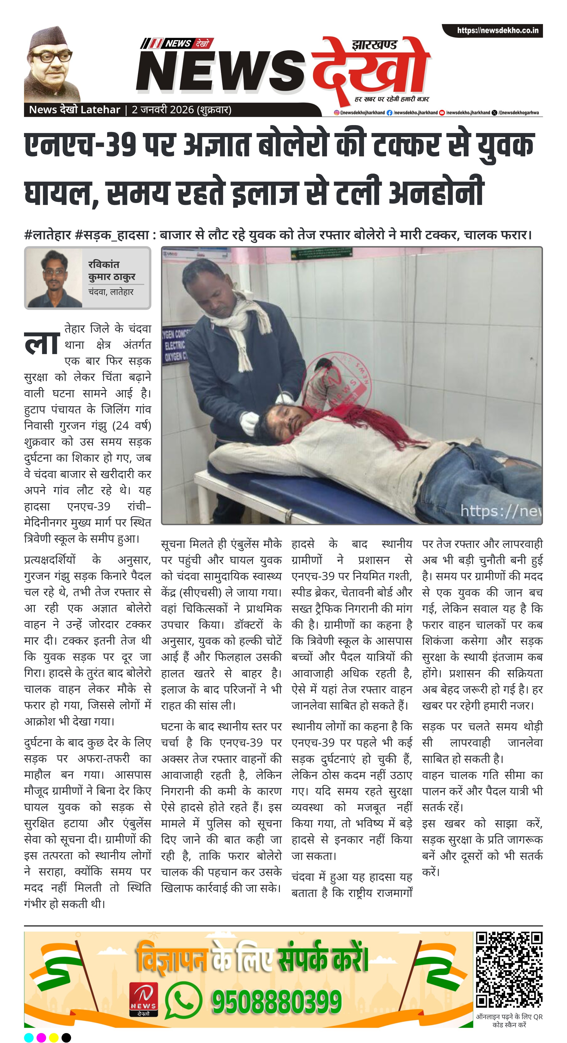- गुरजन गंझु (24 वर्ष) बोलेरो की टक्कर से घायल।