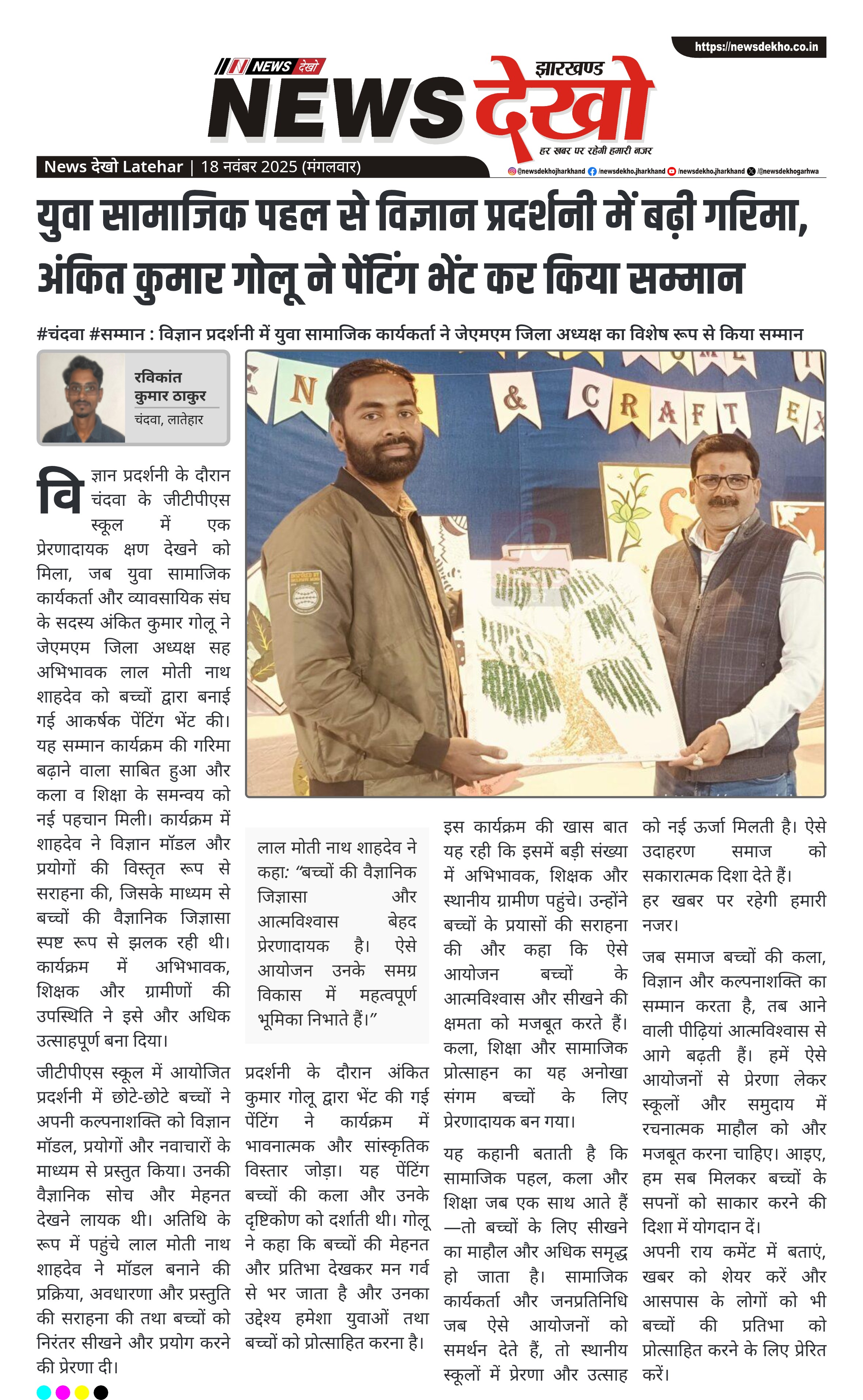विज्ञान प्रदर्शनी के दौरान चंदवा के जीटीपीएस स्कूल में एक प्रेरणादायक क्षण देखने को मिला, जब युवा सामाजिक कार्यकर्ता और व्यावसायिक संघ के सदस्य अंकित कुमार गोलू ने जेएमएम जिला अध्यक्ष सह अभिभावक लाल मोती नाथ शाहदेव को बच्चों द्वारा बनाई गई आकर्षक पेंटिंग भेंट की। यह सम्मान कार्यक्रम की गरिमा बढ़ाने वाला साबित हुआ और कला व शिक्षा के समन्वय को नई पहचान मिली। कार्यक्रम में शाहदेव ने विज्ञान मॉडल और प्रयोगों की विस्तृत रूप से सराहना की, जिसके माध्यम से बच्चों की वैज्ञानिक जिज्ञासा स्पष्ट रूप से झलक रही थी। कार्यक्रम में अभिभावक, शिक्षक और ग्रामीणों की उपस्थिति ने इसे और अधिक उत्साहपूर्ण बना दिया।