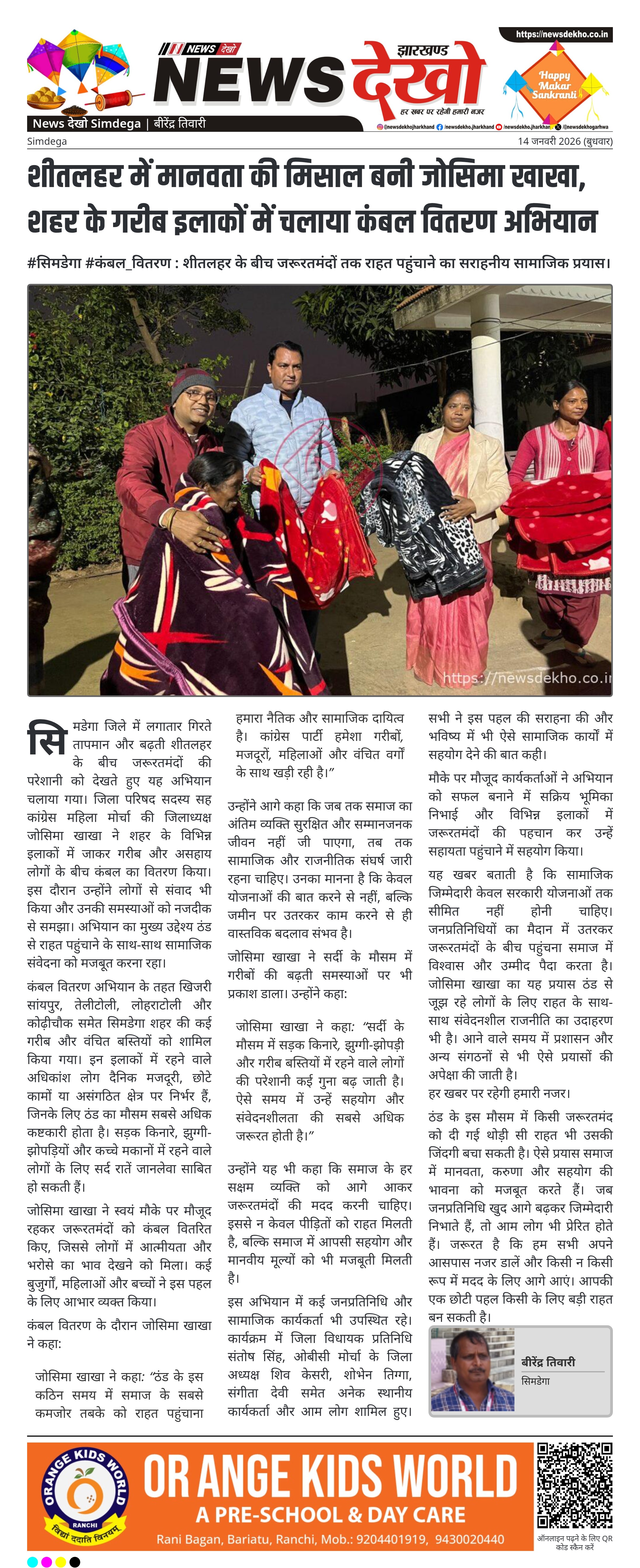 - जोसिमा खाखा ने सिमडेगा शहर के कई गरीब इलाकों में कंबल वितरण किया।